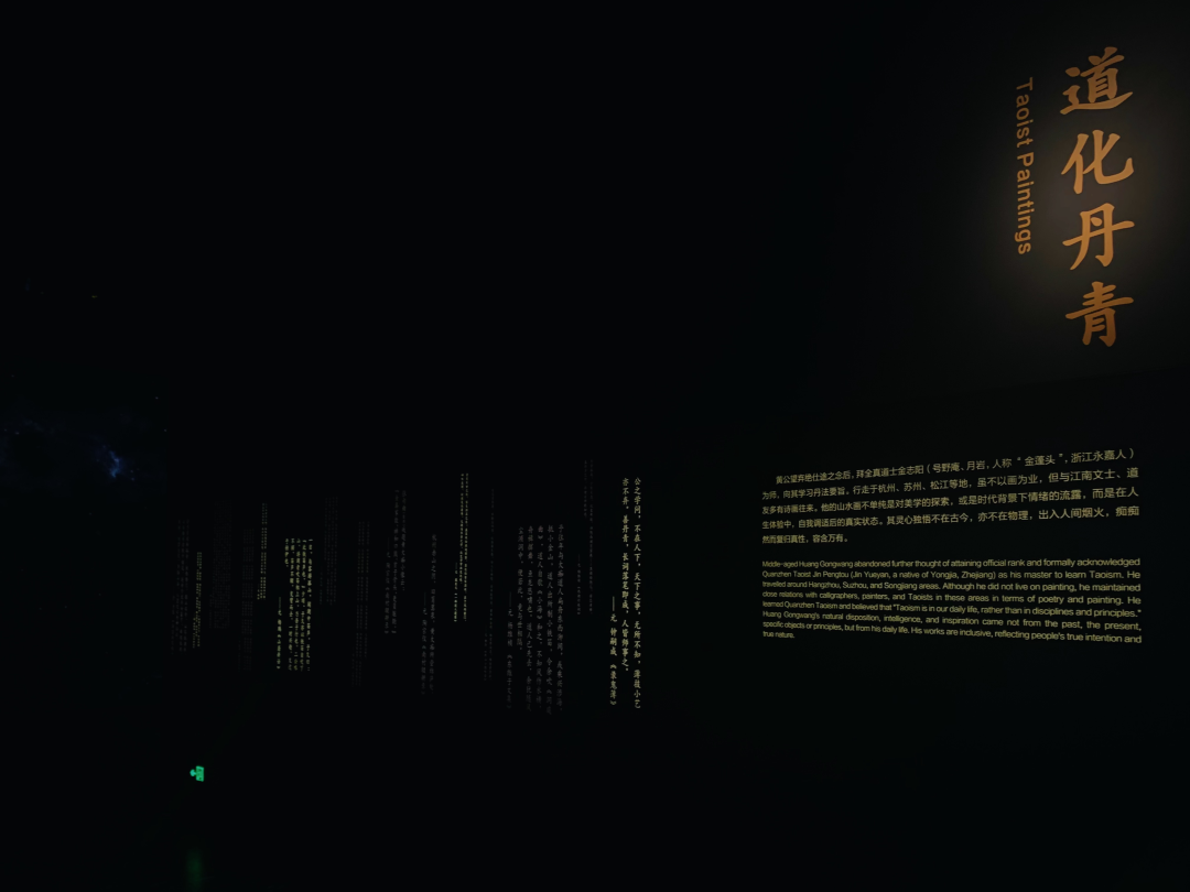 谢佳玲:展厅第一单元《富春山居图》的墙面上印有黄公望的简介和年表时间轴,观众可以了解他并不是太顺的前半生以及淡然平和的后半生。而第二篇章“道化丹青”的墙面上则有黄公望友人及后人对他的描述,仔细阅读的话,会发现黄公望是一个很有意思的人,以及他在杭州的一些行迹。