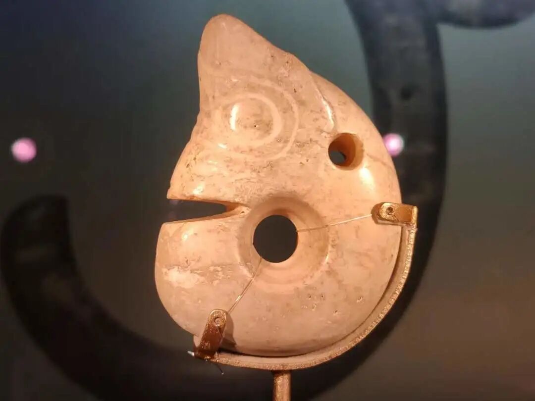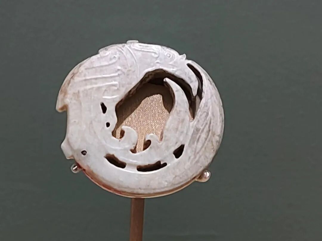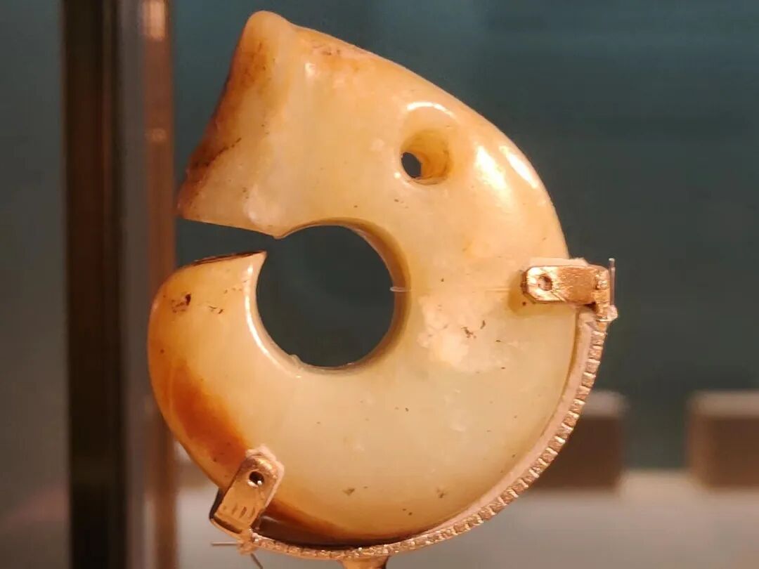 “玦,环之不周也。”即玦是有缺口的环,一般成对出现在墓主人的耳部,一般被认为是装饰用的耳环。玦形龙是红山文化的典型器类,整体形状似玦,都有缺口,但是还有造型和小孔。红山文化出土的玦形龙龙身整体呈 C 形,环成一圈,头部两耳竖立,形似肥大的猪耳,嘴部大张,鼻尖微拱,上有多条褶皱,类似猪的拱嘴状,具有典型的猪首特征,因此也被称为“玉猪龙”。一般认为,玦形龙是祭祀的法器,由巫师随身携带以沟通神灵。玉猪龙作为红山文化重要玉器之一,对于后世产生了重要的影响,殷墟文化妇好墓中的玉猪龙,同红山文化的玉猪龙便有极大的相似点。