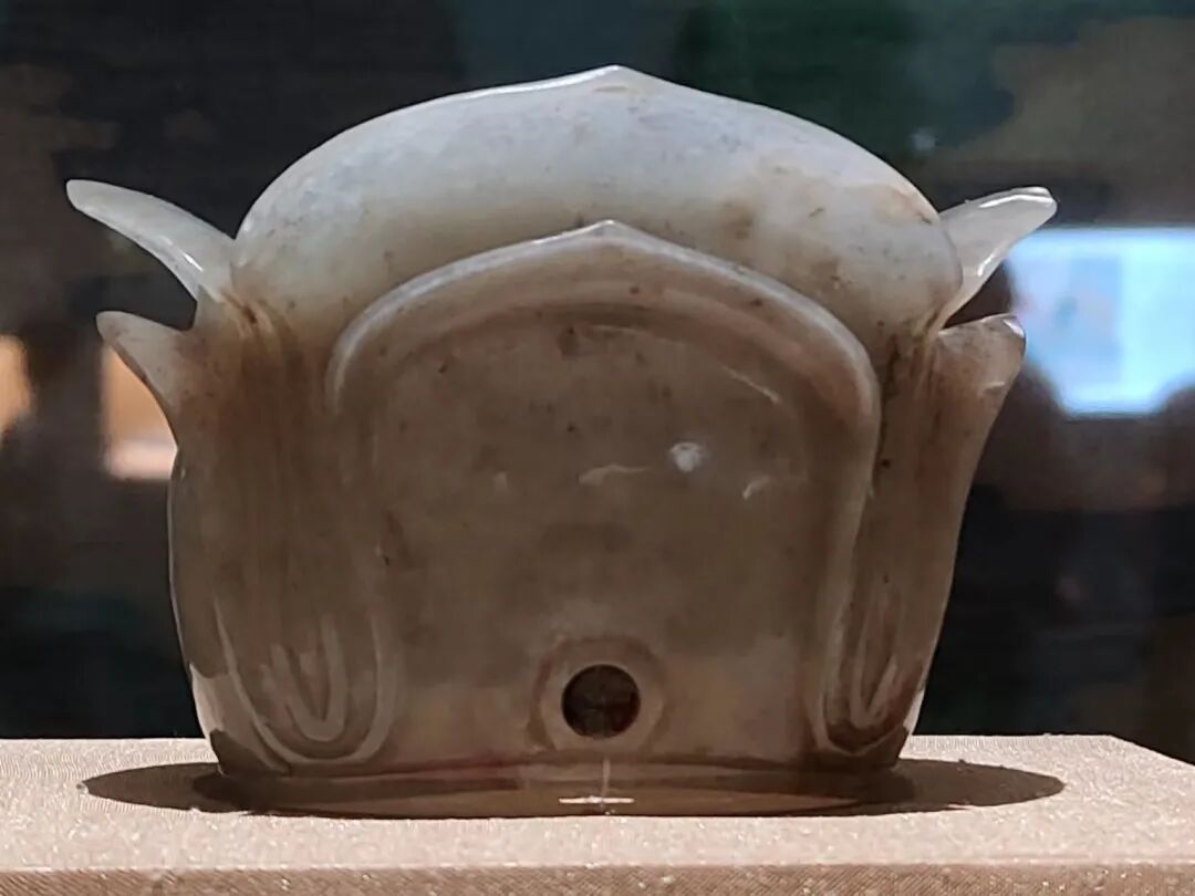 玉质发冠出现于五代,是罩在男子发簪上的装饰,因其高、宽都较其它冠形略低略小,故又被称为“小冠”或“矮冠”, 这类冠式可单独戴束。宋《清异录》载:“士人暑天不欲露髻,则顶矮冠。”莲花瓣纹饰古代传统的艺术题材,荷莲出淤泥而不染,品行高洁,喻意君子之性,因此多受士人阶层的喜爱。在宋代绘画中常能见到头戴玉冠的士人形象。