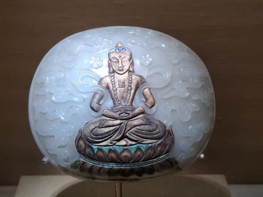 描金,又称填金,指在玉器上事先刻好线的沟槽中压入金丝或填入金粉。描金工艺多施于白玉或青玉上,形成金玉辉映的华丽效果。