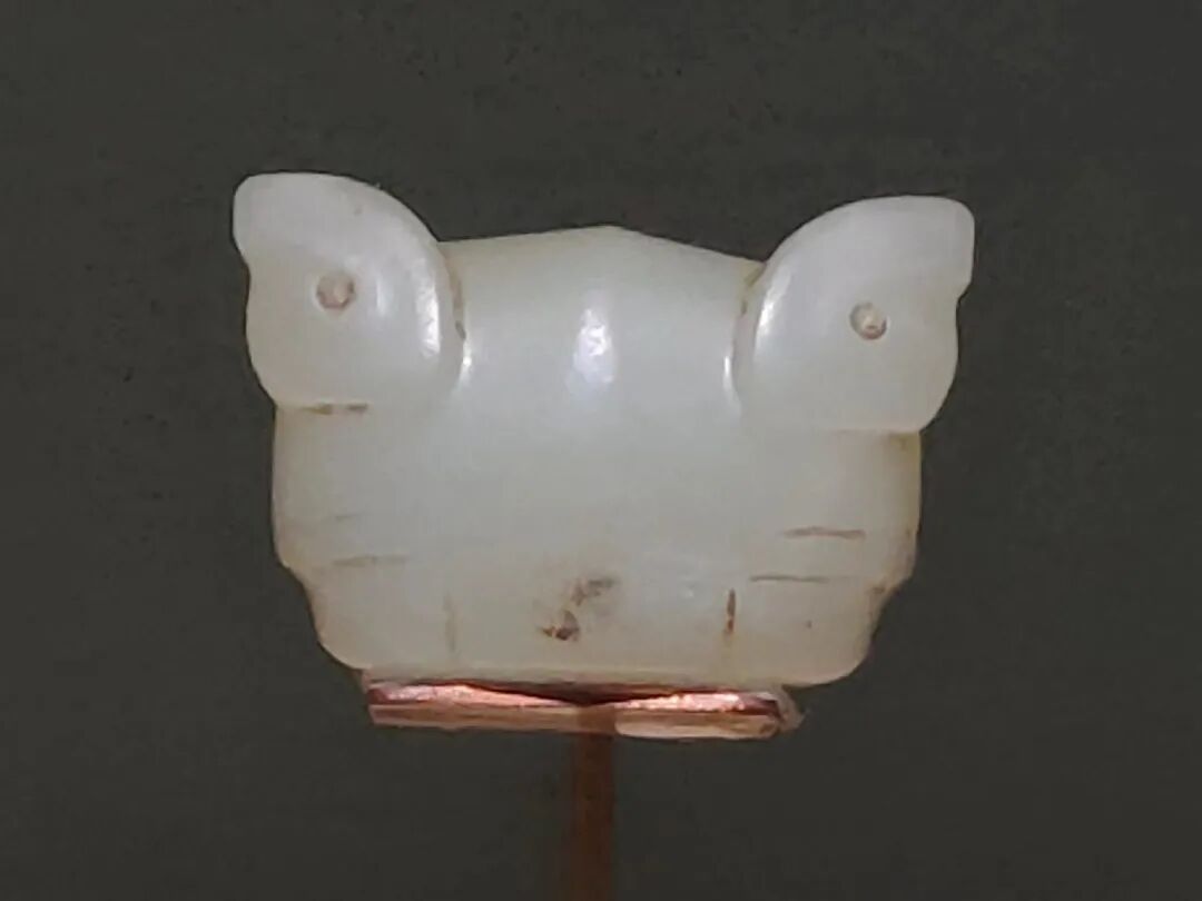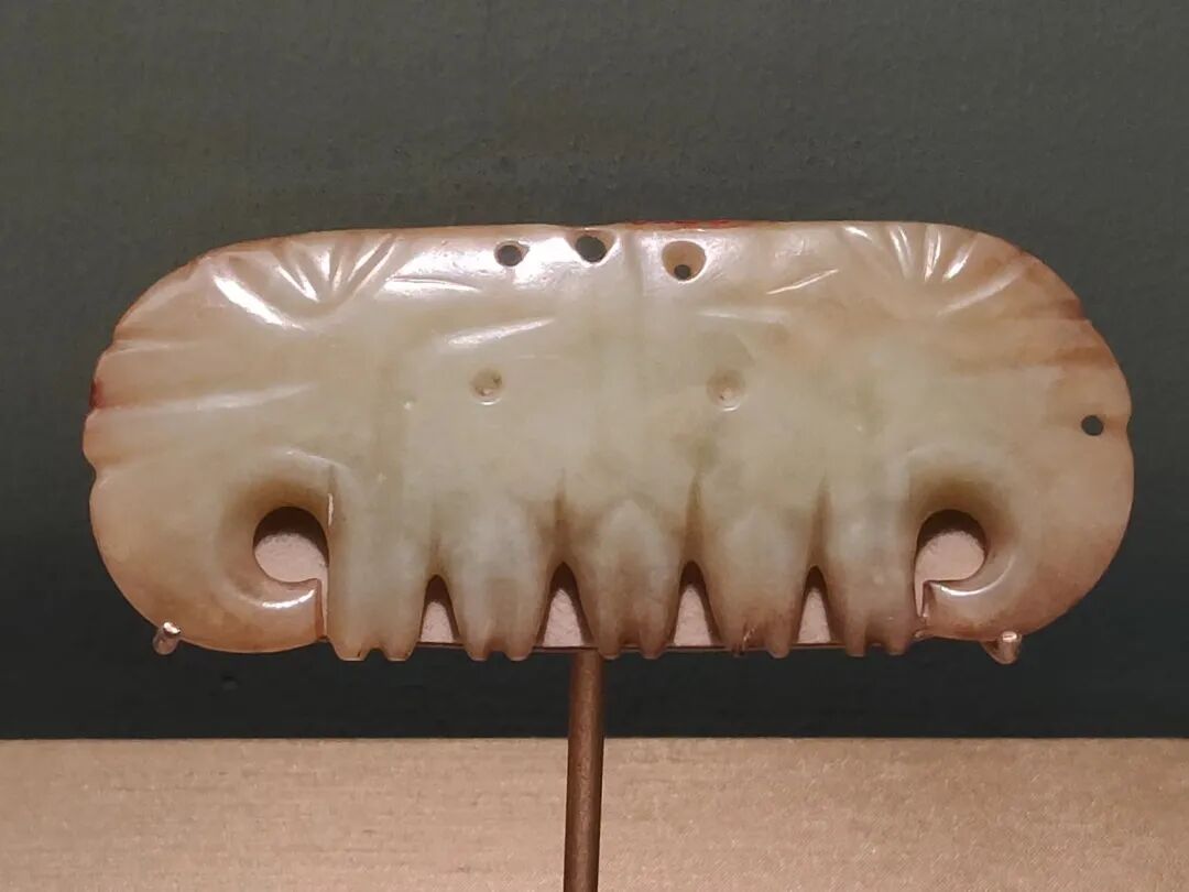 神面形器是红山文化标志性玉器之一。正面以阴线刻神面纹,圆眼内凹,下部雕一排长齿,左右两端是变形的犬齿或翅膀。类似玉饰的侧边或背面都有穿孔,可以缝在织物上。