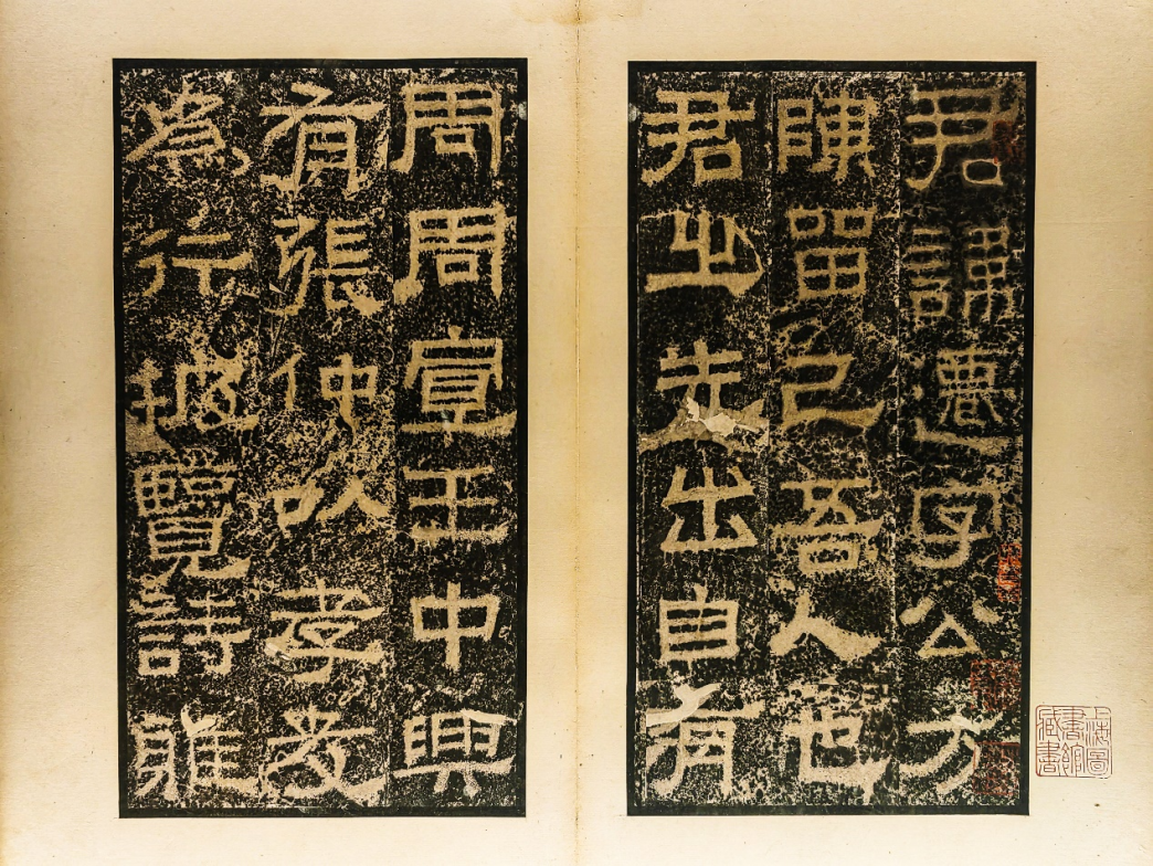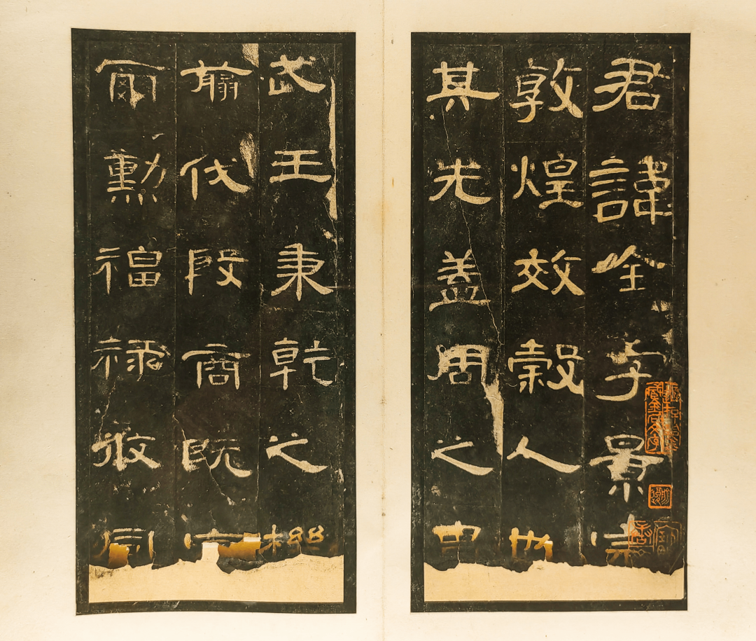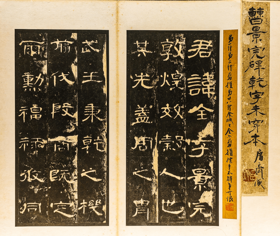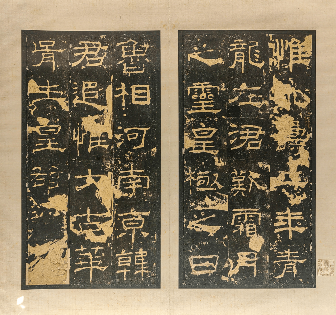 值得注意的是,石门颂中的“命”、“升”、“诵”诸字竖笔均刻意拉长,保留了汉代手写简牍的风格,很好地还原了当时人真实的书写习惯,在现存的汉碑中属绝无仅有之作。本次展出的石门颂为清末著名藏家沈树镛旧藏的乾嘉拓本以及汪大燮藏乾嘉淡墨拓本。原石因水库修建,现已移入汉中博物馆。