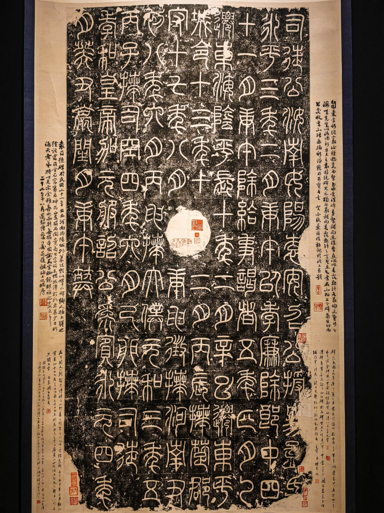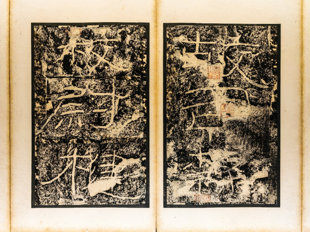 本次展出了沈佺旧藏嘉道拓本以及于右任旧藏朱拓本。后者整幅原大展出,异常精美,仿佛身临其境,可以说是本次展览最重量级的几件之一。五瑞图也一并拓下,仔细辨认即可看到黄龙、白鹿、嘉禾、木连理、甘露五种祥瑞——这些是上天对李翕工作的认可。