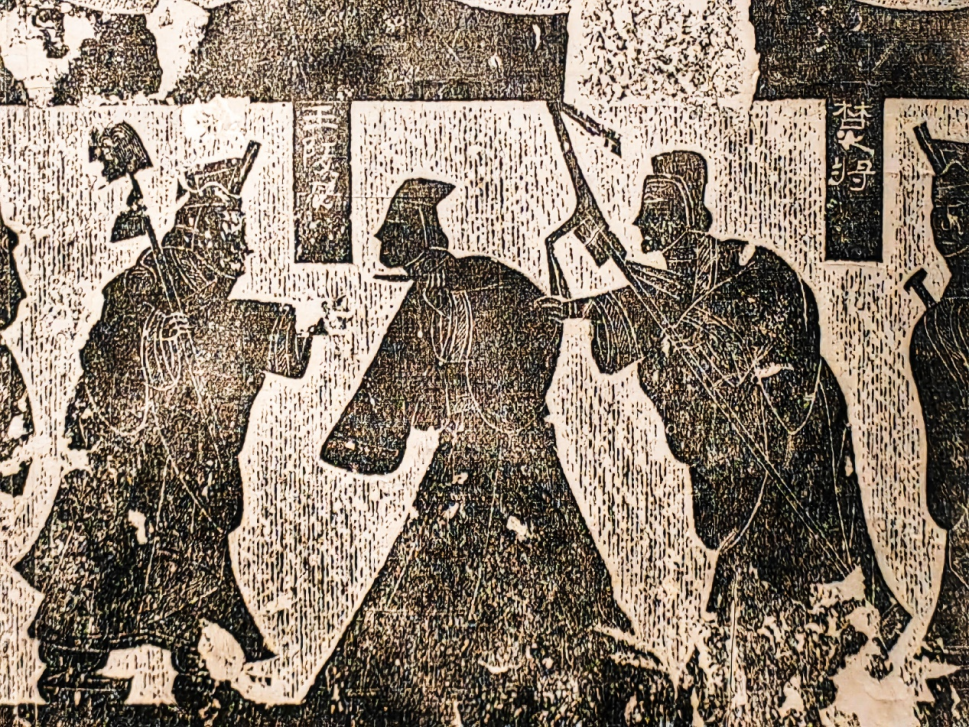 汉代艺术家没有去表现王陵的荣华富贵,而是选取了他母亲拔刀诀别的瞬间来描绘。汉使者站在她前方伸手作势阻拦,她身后的楚军士兵更是已经把手搭在了她那持刀的左臂上。
