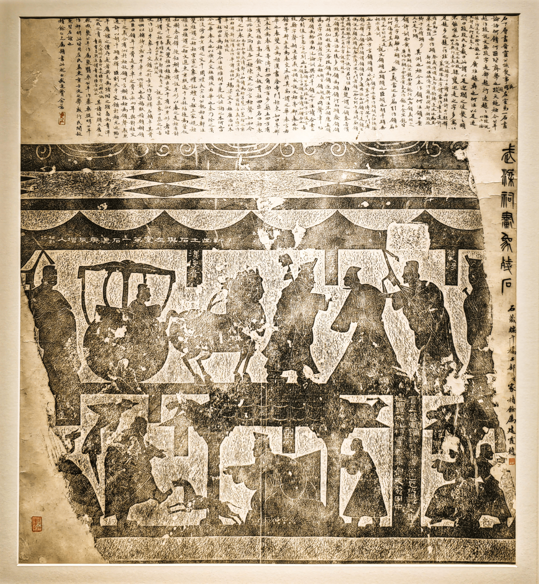 上层即王陵母自刎故事,下层左栏表现晋灵公放狗咬赵盾的典故,右栏刻画另一则历史故事。原石本是汉代武梁祠的建筑构件,又称“武梁祠画像残石”。