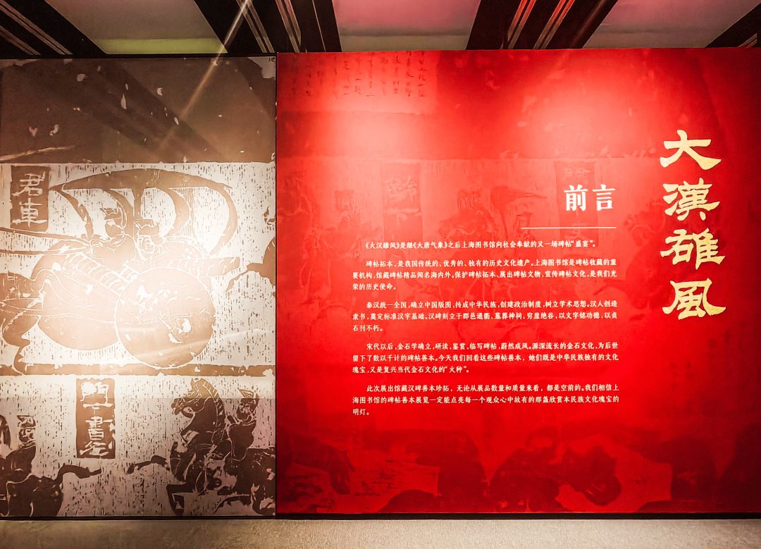 “大汉雄风——上海图书馆藏汉碑善本展”特展位于上海图书馆东馆一楼 1 号展厅,展出时间为 2023 年 10 月 30 日至 2024 年 1 月 7 日。90 余件重量级汉碑善本尽数展出。