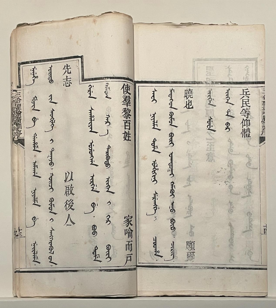 清初,世祖福临(1638 年—1661 年)以“六谕”安民心、训天下,所谓“六谕”也就是明太祖朱元璋提倡的儒家思想“孝顺父母,尊敬长上,和睦乡里,教训子孙,各安生理和毋作非为”六个方面。圣祖玄烨(1654 年—1722 年)增为《圣谕十六条》,世宗胤禛(1678 年—1735 年)加以解读而成《圣谕广训》,所以称为《三合圣谕》。清朝士子凡欲取科甲功名者,均需熟读、默写。清人重视满、蒙、汉和谐相处,雕版也使用满、蒙、汉三种文字合璧刊行。