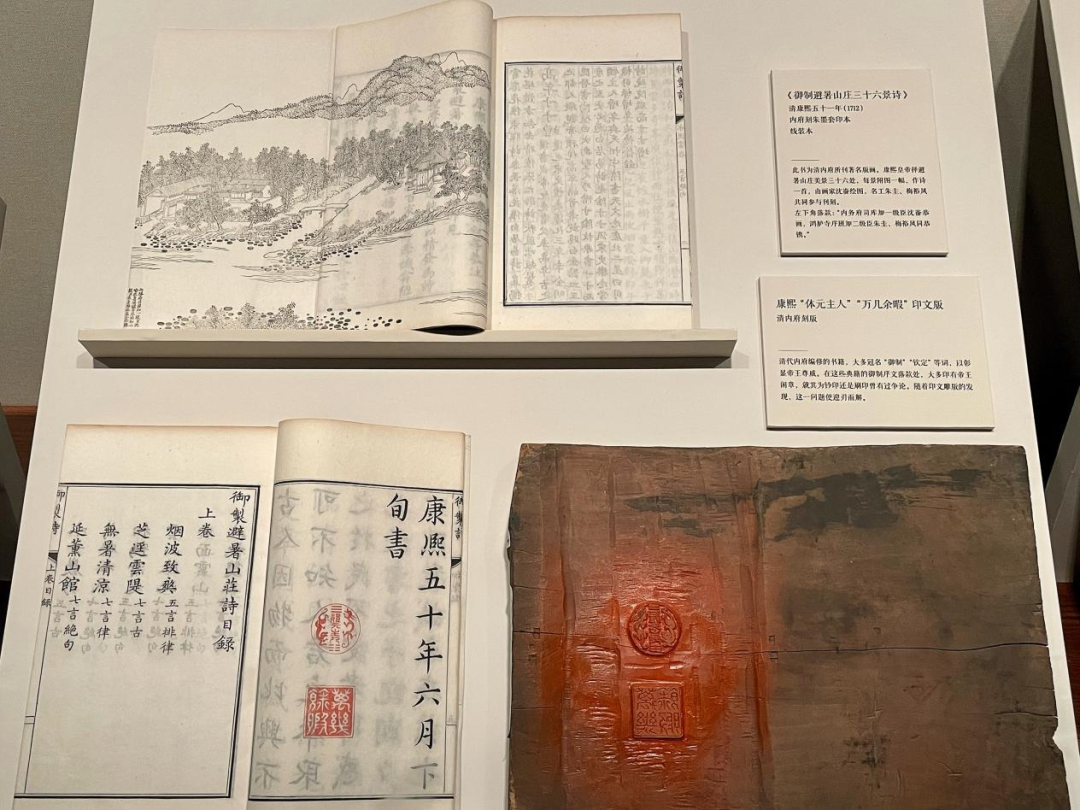 清代内府编修的典籍,御制序文落款处是钦印还是刷印?关于这一争论随着展出的康熙“体元主人”“万几余暇”刻版而水落石出。印文雕版既显示出帝王尊威,也便于书籍印刷,一举两得。