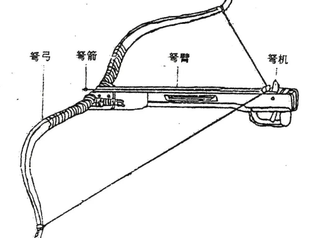 弩在弓的基础上发展而来,由弩臂、弩弓和弩机三部分组成。弩臂由坚木制成,木臂正面有一条放置箭镞的沟槽,能够保证发射出的箭沿直线前进。弩弓一般用竹木制成,形似扁担。弩机安装在弩臂的后面,青铜制成,具有延时、贮力、瞄准、激发四合一的功能。