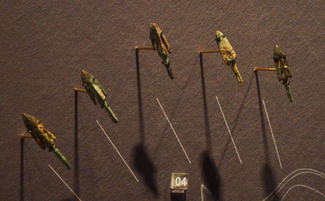 秦代箭镞将头部改为阻力小、定向准的三棱锥,配合长箭杆使用,杀伤力远超前代。统计表明,秦人弩机及部件和箭头达到了相当的标准化生产水平,弩机的部件可以互换;箭头底边宽度的平均误差只有正负 0.83 毫米。
