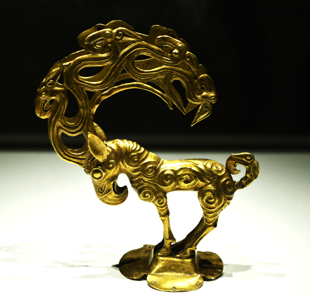这件器物出土于陕西省神木县一个匈奴墓中,据推测是一位匈奴族首领帽上的冠饰。之所以被称为怪兽,是因为它集合了多种动物的特点,身体似羊,嘴似鹰,角似鹿,蝎形尾,四蹄则立于花瓣形托座上,两只抵角由 16 只两两身相连、背相对的小鸟组成,蝎形的尾巴也是一只小鸟的样子。匈奴是游牧民族,生活与动物紧密相关,所以他们的工匠将多种动物形象集于一体,体现了工匠的睿智巧思和匈奴人对动物的崇拜。
