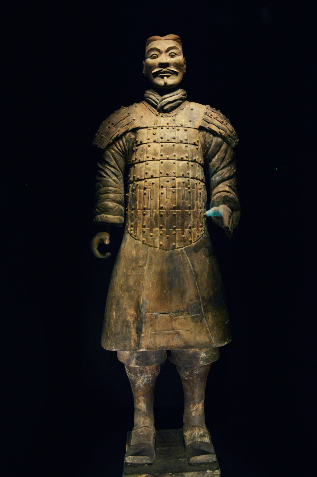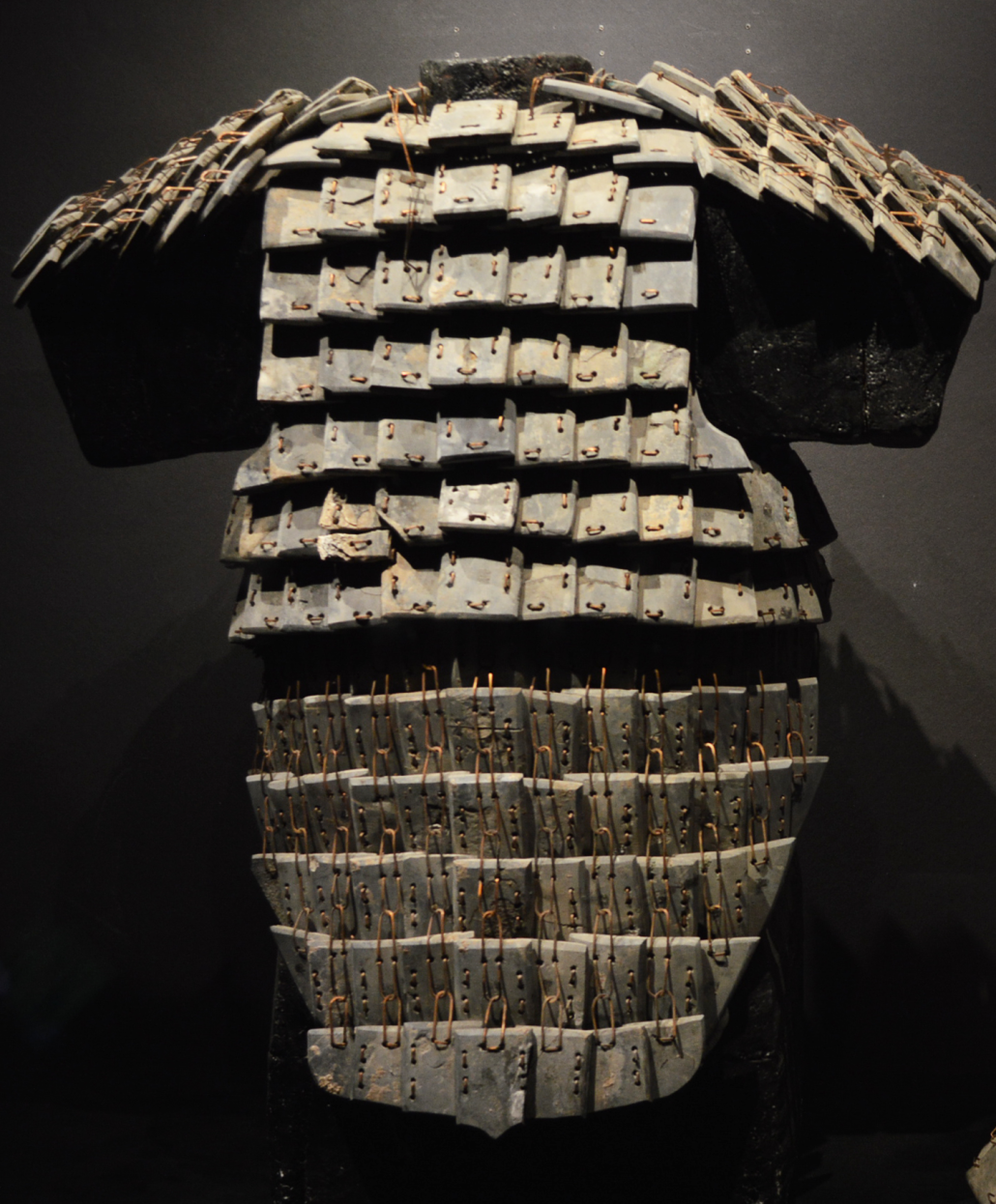 秦代铠甲在形制和编缀方法上已形成了一整套成熟工艺。编缀的铠甲形式多样,因兵种及身份的不同而形制有别。上部与下部分别采用固定甲片与活动甲片不同的方法。甲片有长方形、舌形等腰梯形、直角梯形、圆形等多种形制,用扁铜条将其联缀在一起,除了可以保护士兵的胸腹、后背和腰肋外,还能使人身体的腰部、手臂等部位不受束缚,活动自如,方便他们做出挺胸、弯腰、举臂等动作。