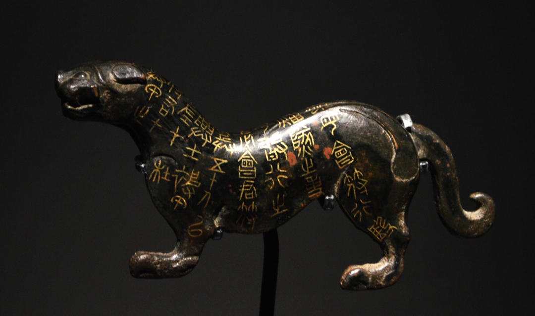 虎符多为铜制,制成虎形,一件虎符从虎头至虎尾沿背誉中线部开为左右两半,虎身上铸刻有文字,君主和朝廷与派驻地方的将领各执一半。这件杜虎符为战国晚期秦国兵符,现存左半符,正面突起如浮雕,背面有槽。虎身有错金铭文九行 40 字,大意为:凡调兵超过五十人,杜地将军的左符须与君王的右符契合并勘验无误,才能行动;但如果遇到需点燃烽火报警的紧急情况,不必合验兵符即可行动。