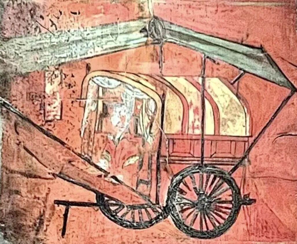 宋绍祖墓出土的两辆“牛拉鳖甲车”就属于通幰车。车厢四隅立柱,车盖隆起形似鳖甲,外部用墨线勾勒出方格图案,车厢内部涂饰红彩,典雅大气。车身两侧各开窗两扇,窗下分别有三个小孔,用于插杆张幔,可惜木杆和丝织物均已泯灭无痕。车舆底座还做出精巧的凹槽设计,用以固定车轴,前部左右两侧各有一孔,方便插辕驾车。木制的车辕和车轴也都腐朽失落了。