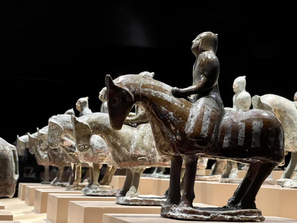 大同市博物馆将陶俑按照墓葬里的摆放形式展出,威严的俑阵透出一股横扫千军的大魏雄风。整个俑阵大部分采用釉陶材质,前两列是轻骑兵,头戴鸡冠,脑后风帽是鲜卑族特有的服饰。左右两列仪卫俑则头戴圆顶风帽,披虎皮风衣。