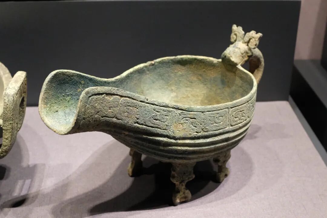 【窃曲纹铜匜】春秋早期 1966 年京山苏家垄出土,上腹部饰窃曲纹,下腹部饰瓦纹,后腹接龙首鋬。三足作兽首形。盘、匜是水器组合,用于沃盥之礼,匜用来浇水,盘用来盛弃水。