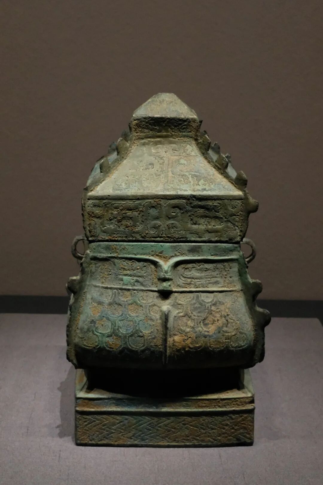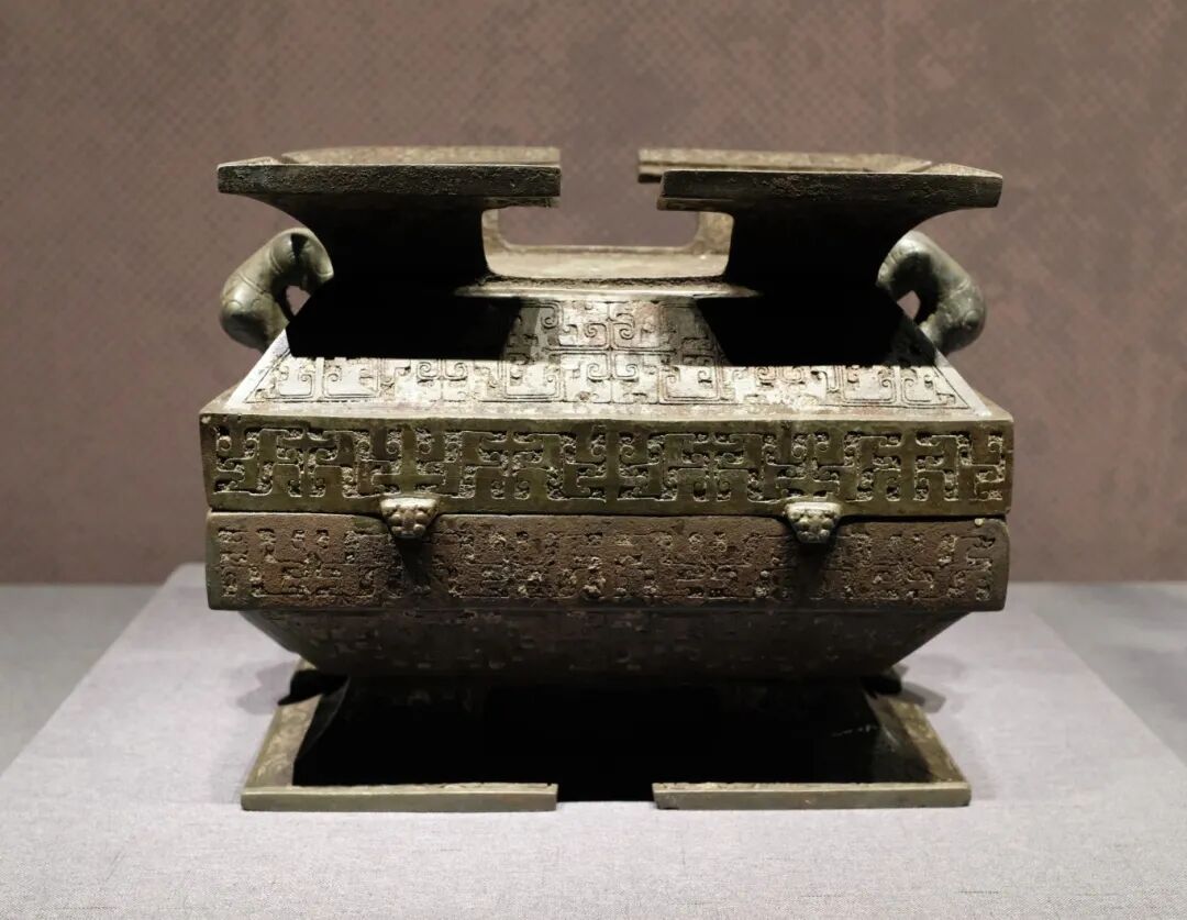 器、盖皆方,盖呈四面坡屋顶形。颈两侧有环耳,造型类似方彝,但从环耳推测,本件可能原有提梁,应该是青铜方卣最晚的样式。