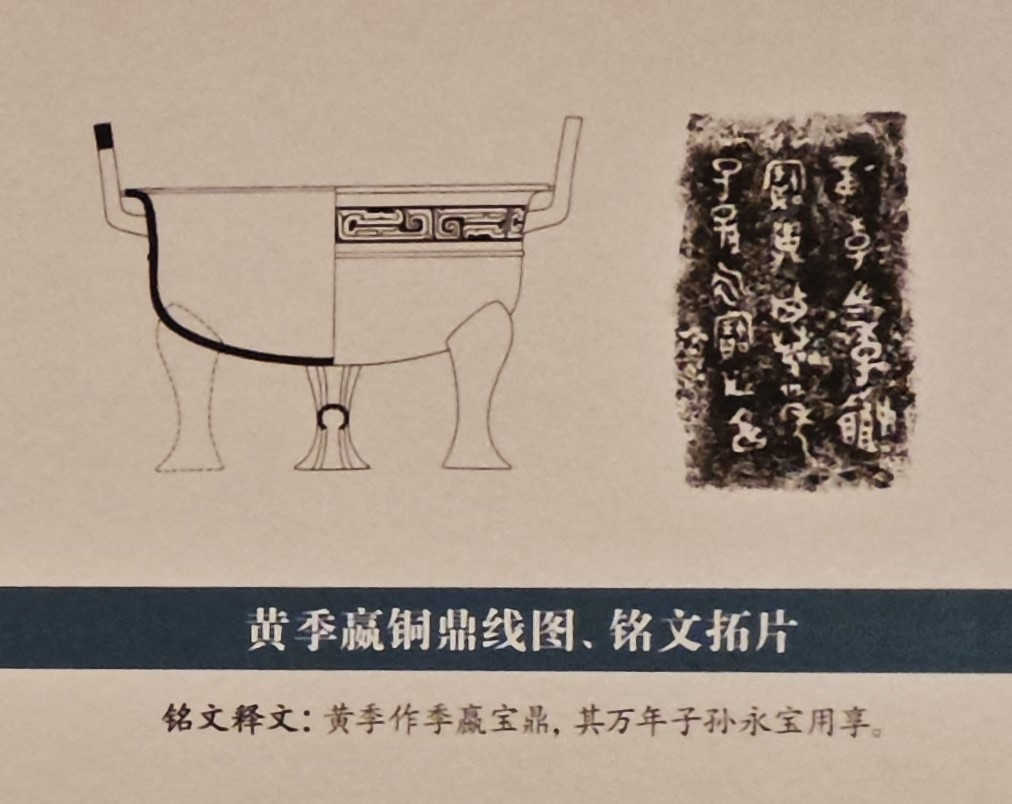 本件内壁铸有铭文:“黄季作季嬴宝鼎,其万年子孙永宝用享”。黄国为嬴姓诸侯国,位于今河南省潢川县附近。春秋时期,曾国与黄国关系密切,曾国墓地常出土黄国青铜器,本件可能是黄国女子嫁到曾国的陪嫁品。