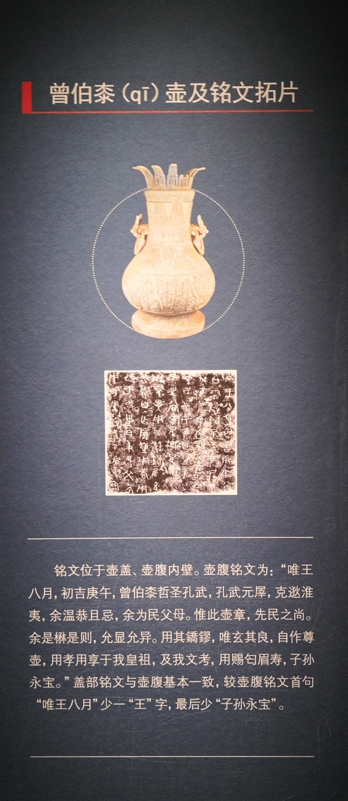 本件器盖、器身以瓦纹、重环纹为饰,捉手内饰双身共首鸟纹。盖内、器内铸有铭文:“唯曾伯文自作宝簋,用赐眉兽黄耇,其万年子子孙孙用宝用享”。