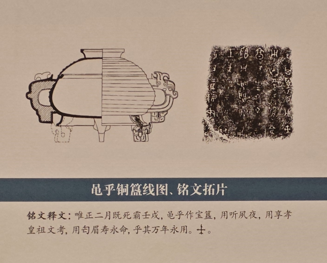 两件铜簋器形、纹饰相同。器底内与盖内均有铭文:“唯正二月既死霸壬戌,黾乎作宝簋,用听夙夜,用享孝皇祖文考,用匄眉寿永命,乎其万年永用。”“黾乎”为人名,可能是商人的后裔。1966 年苏家垄出土的七件铜簋与九件铜鼎原属不同的礼器组合,被拼凑作为墓主人曾仲斿父的随葬品。
