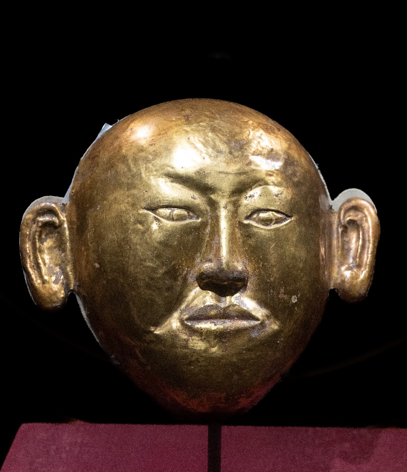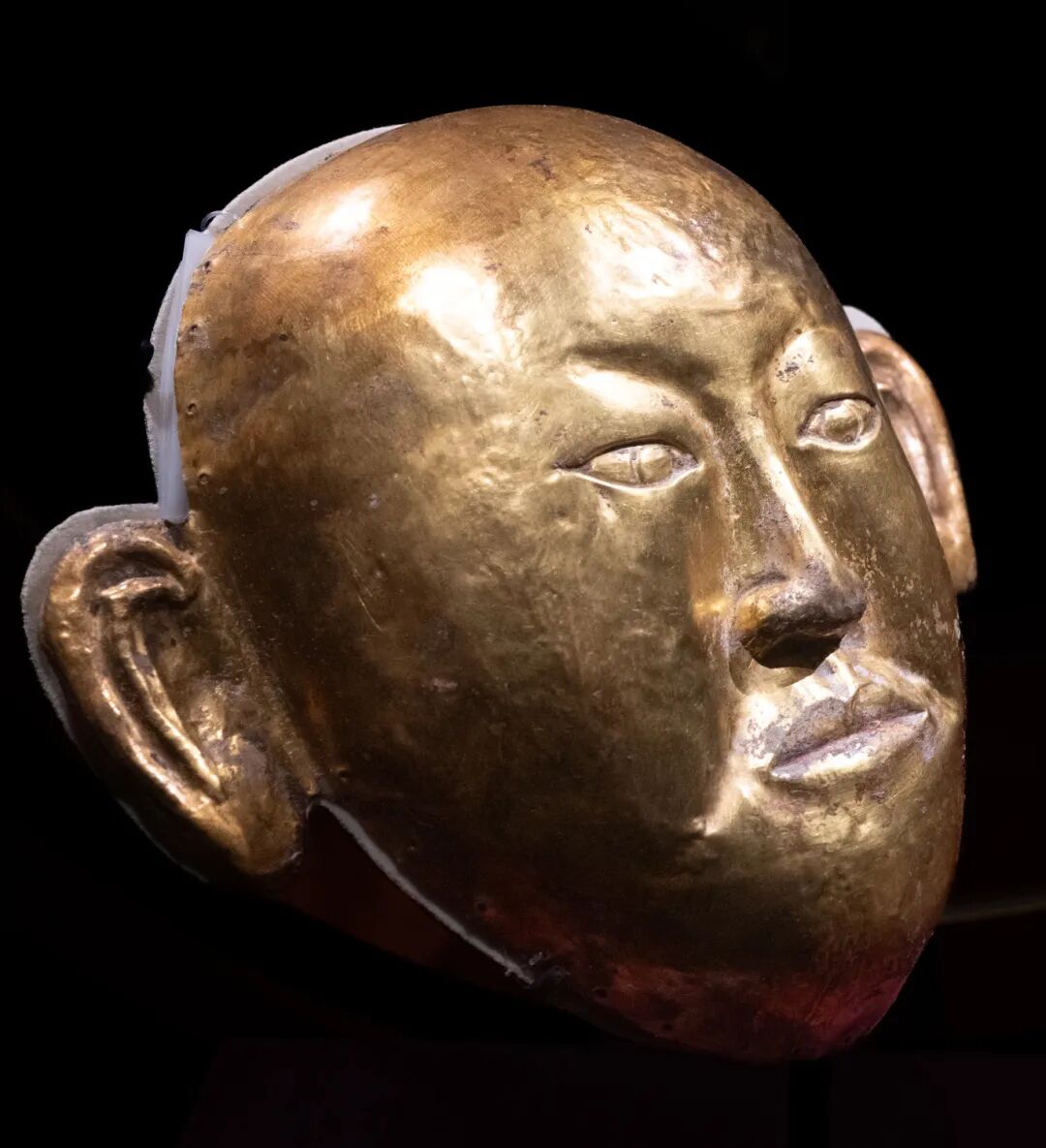 现已发掘来自辽代墓葬的金属面具不下十副,其中铜面具占多数,少数为银,黄金面具为最高规格。陈国公主驸马合葬墓中由黄金打造的面具实属为契丹丧葬习俗中的最高形制。