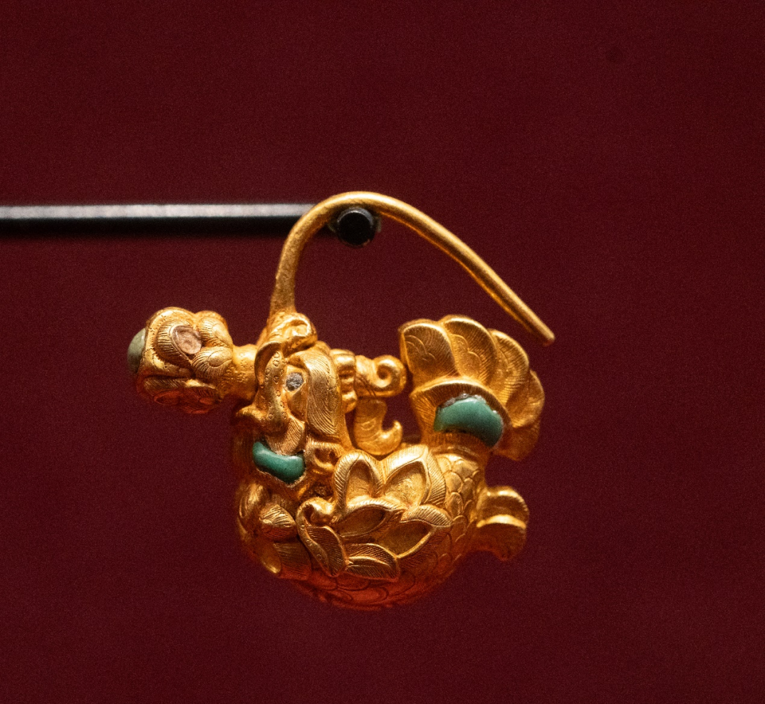 捶揲、焊接成形,中空。摩羯身形卷曲,双翅舒展,尾巴上翘,口衔金花。颈部、尾部及花球上镶嵌绿松石,全身錾刻细密纹饰。