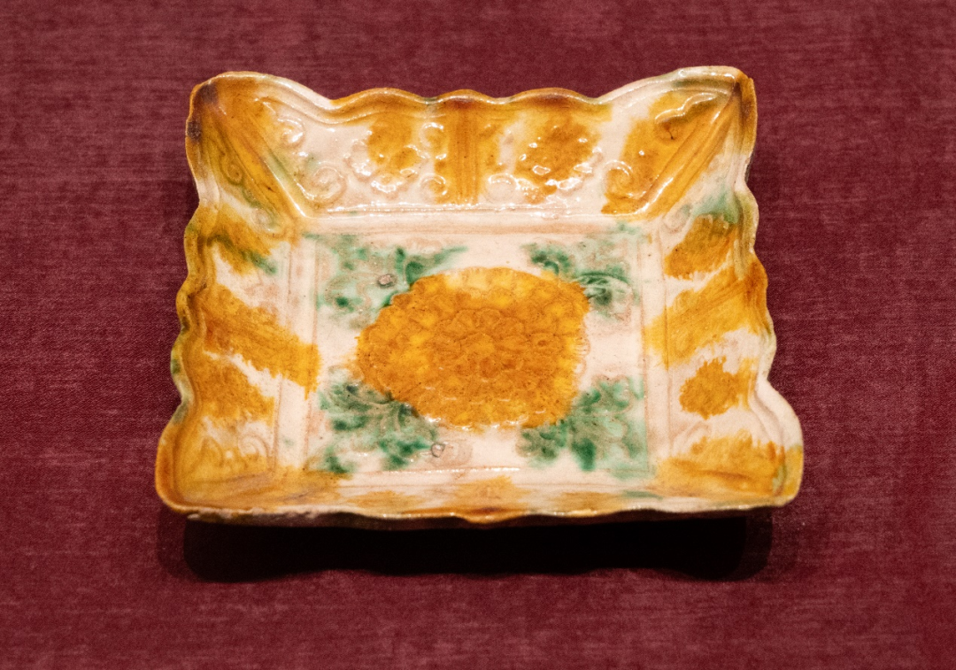 形制、大小相同。方形,花边形口,斜壁,平底。内壁模印花叶纹,内底正中印一朵菊花,四角衬以花叶。内壁施黄、绿、白三色釉,外壁至底无釉。