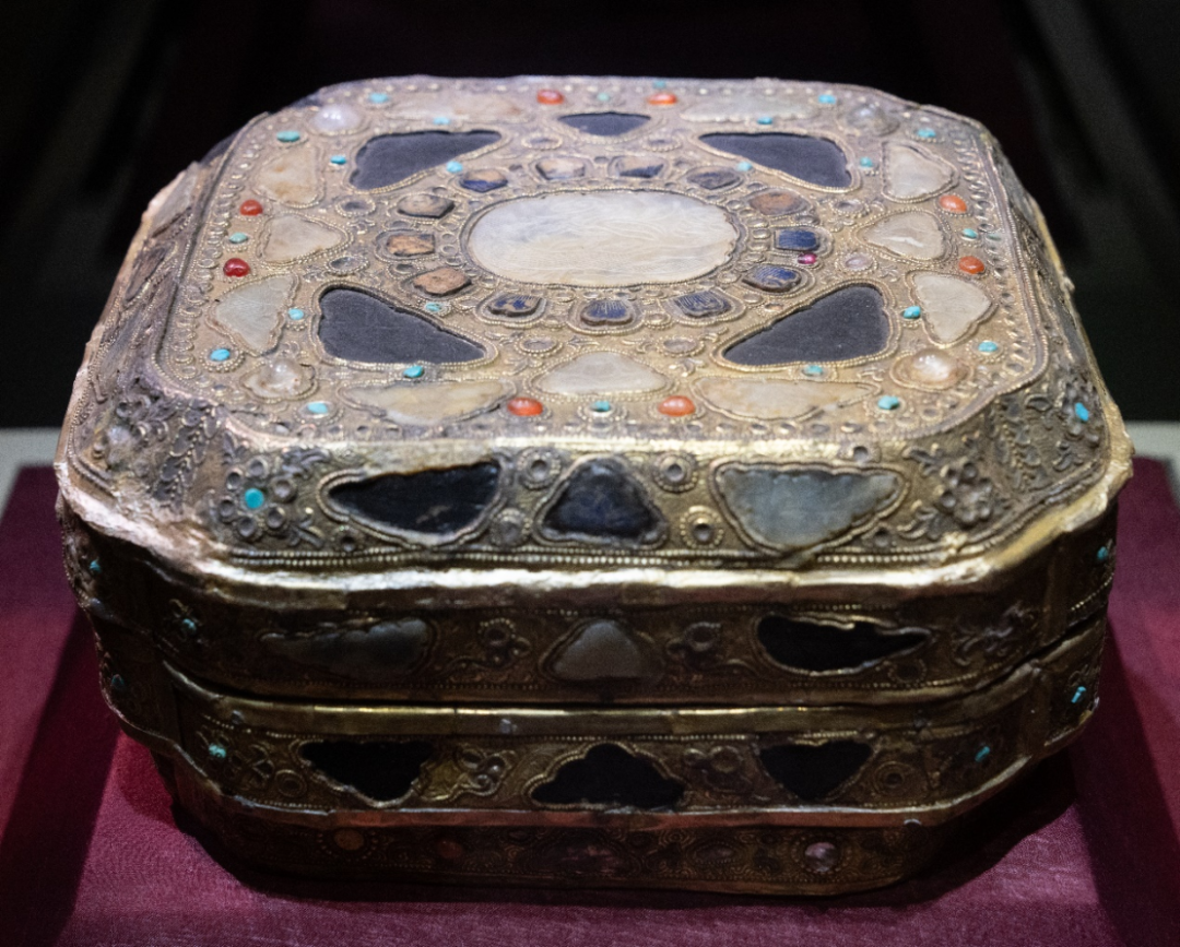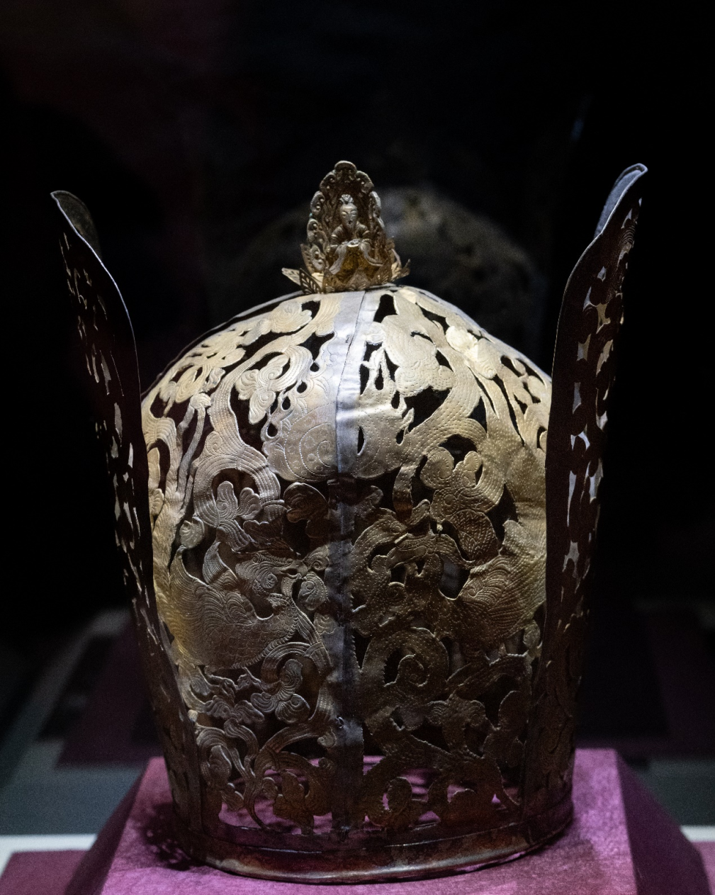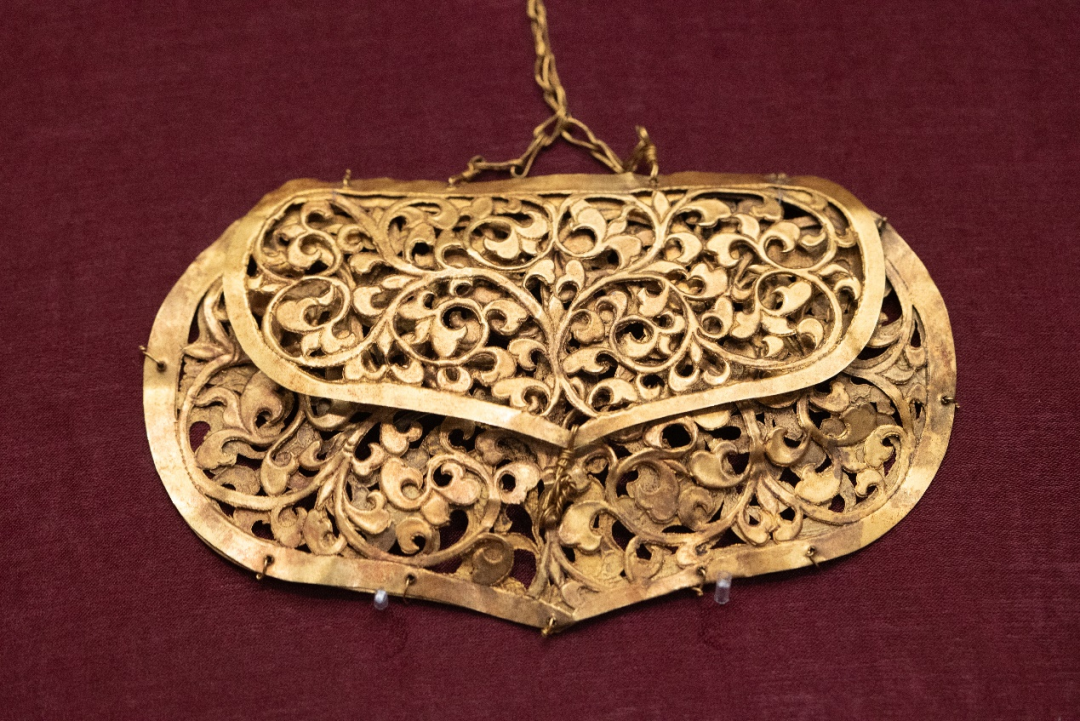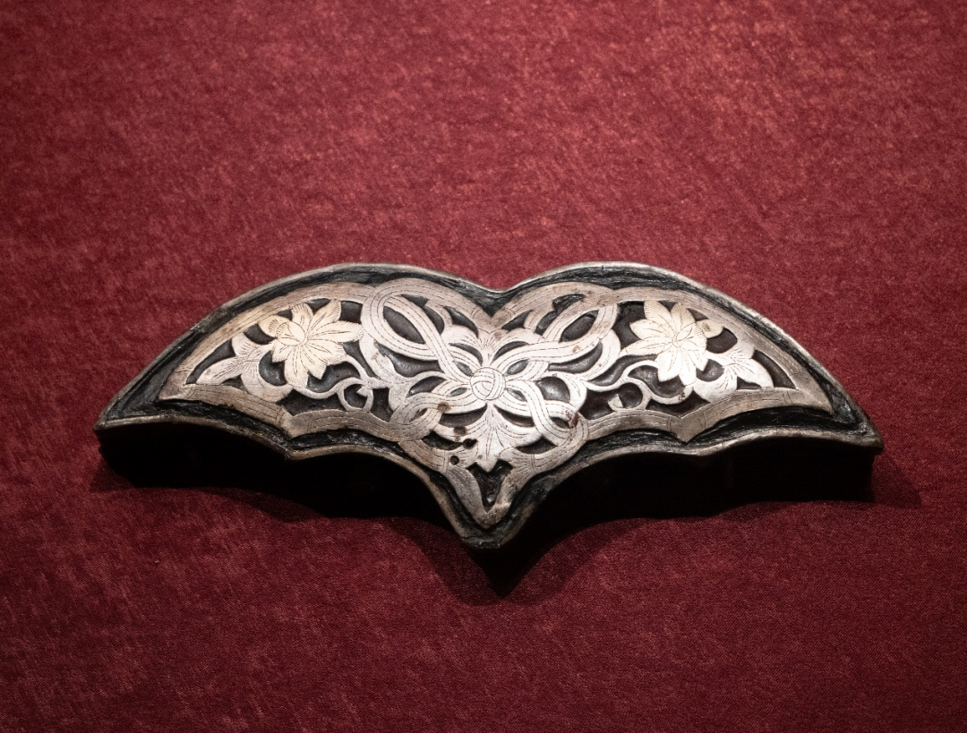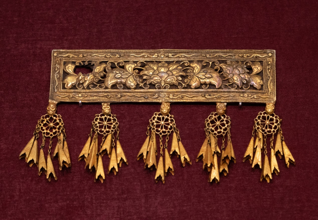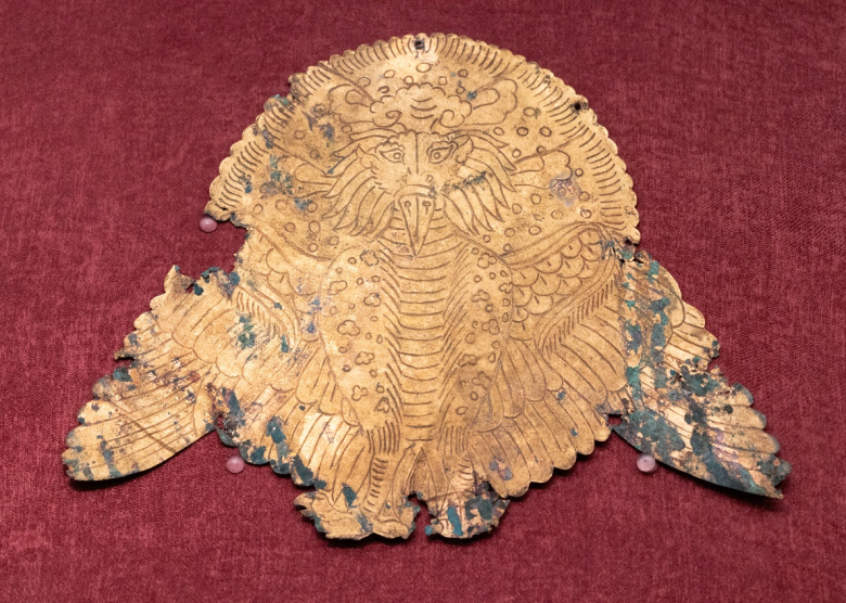辽代建立之后,受到汉族文化的影响,契丹刮起了戴冠饰之风,公主高翅鎏金银冠是典型代表之一。结合《辽史》记载,这件高翅鎏金银冠是朝廷赐给陈国公主与驸马的结婚礼物,装饰精美华丽,佩戴于重大典礼之时。