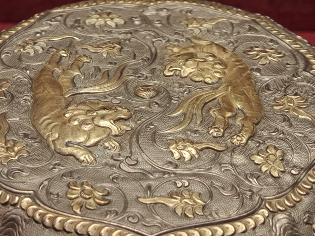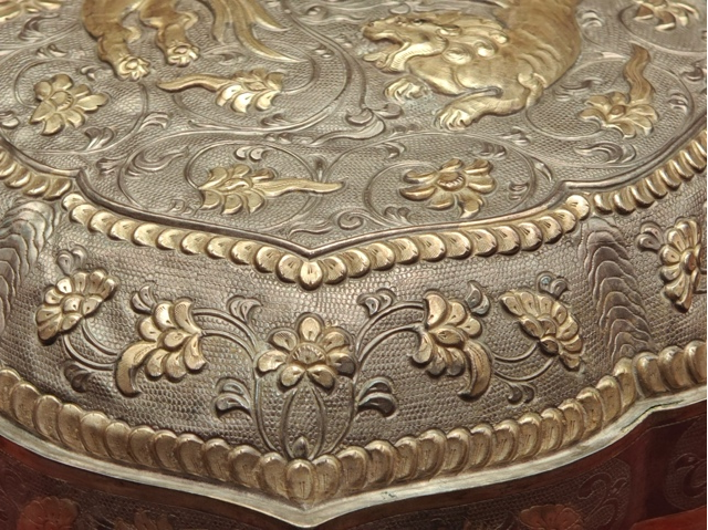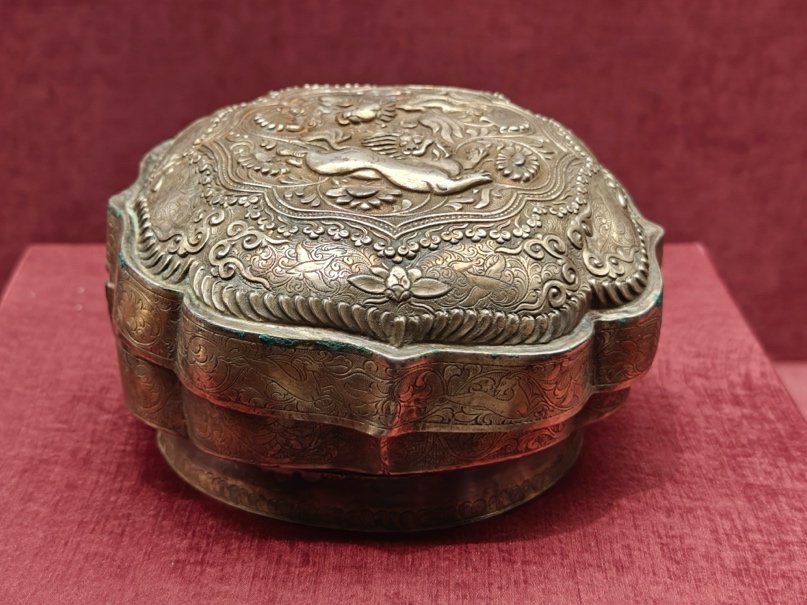 银质,纹饰錾刻、鎏金。整体呈十曲花口形,高圈足,以子母口相扣合。盖顶中央横压錾刻龙纹,龙身卷曲,细颈长嘴,张牙舞抓,须发飘扬,威严勇猛,周饰卷云纹。盖肩部为十只长尾飞鸟,或振翅分飞,或展翅回首。盖及器身侧面饰牡丹纹、凤纹和狮纹。