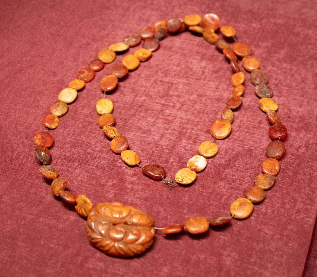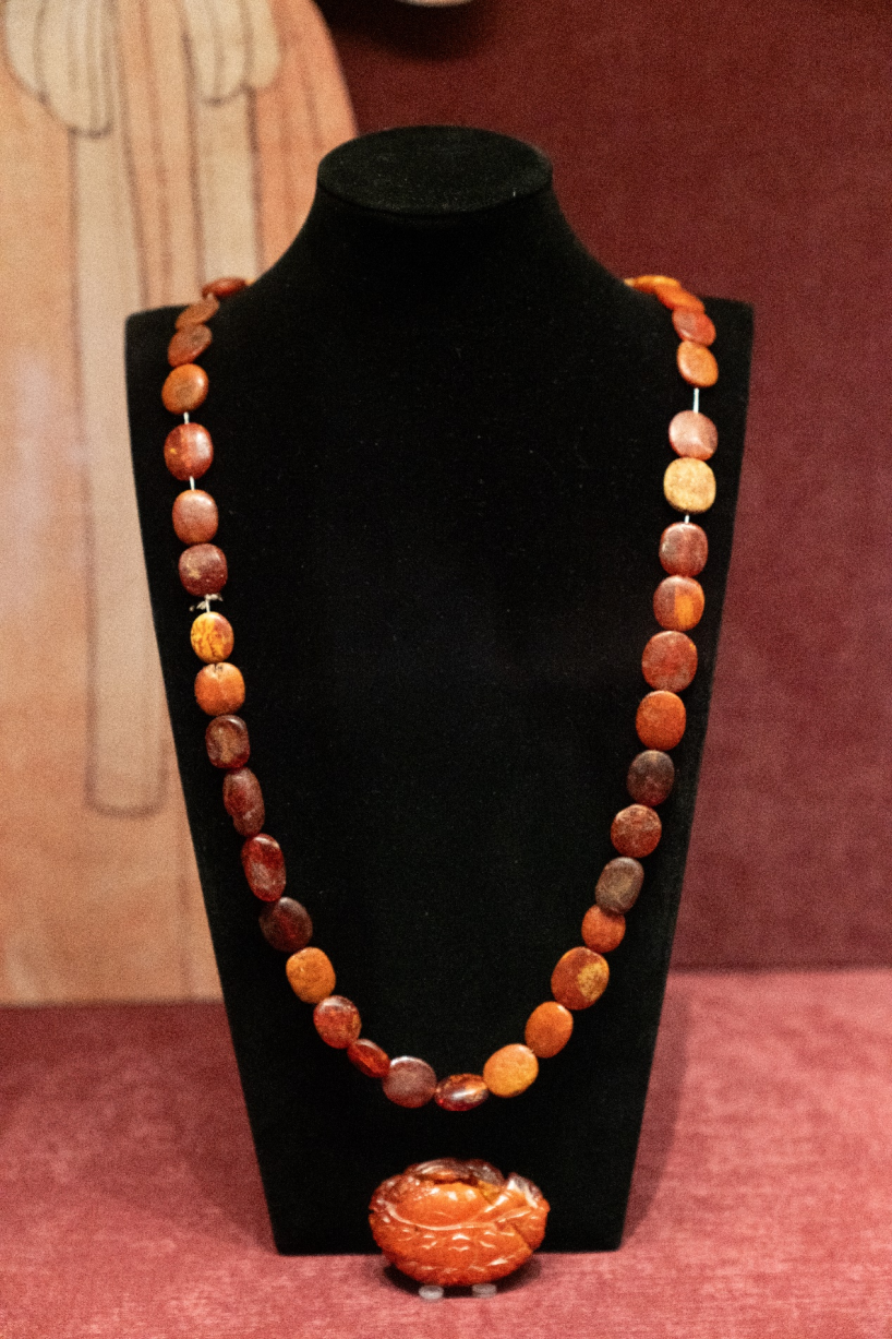 由 45 颗琥珀珠和一件琥珀浮雕饰件以银丝穿连组成。琥珀珠,红色,扁平椭圆形,有穿孔,大小不一。浮雕琥珀饰件,红色,椭圆形,正面为双鱼莲花纹,侧面有穿孔。
