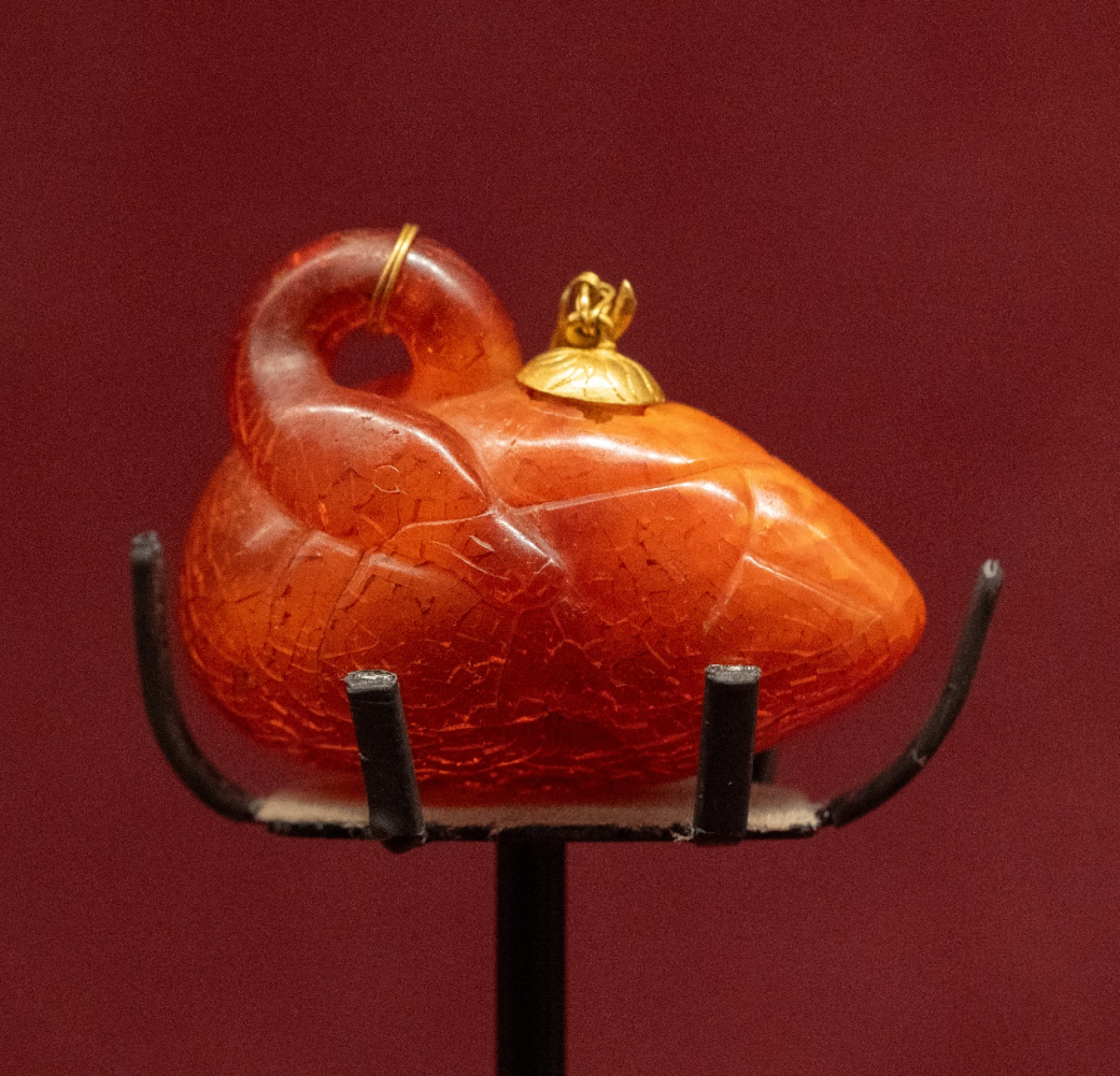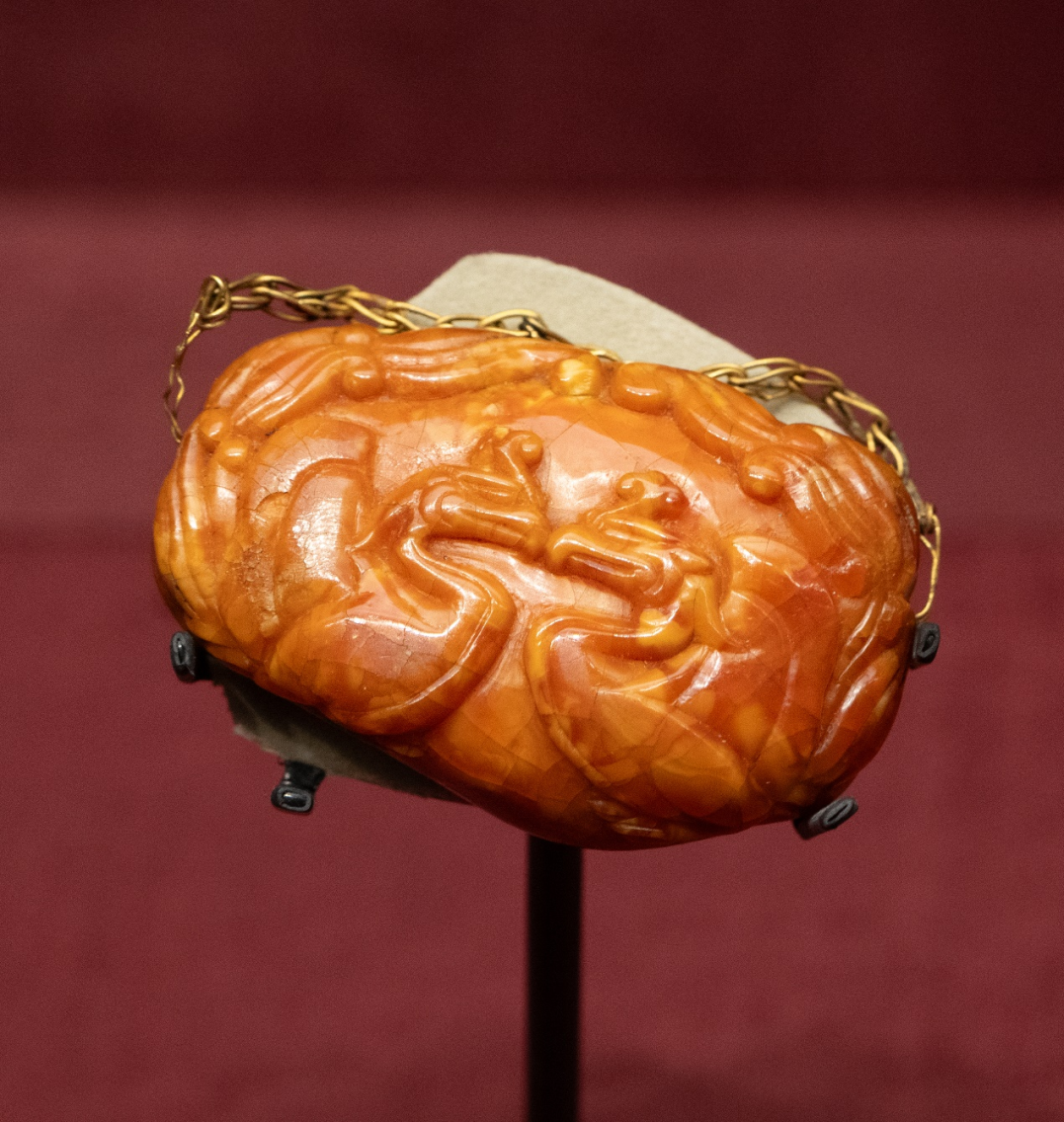 从材质上看,辽代出土琥珀的墓葬和遗址近40座,共出土琥珀制品两千余件,其中又以陈国公主与驸马合葬墓出土的琥珀制品最为丰富。陈国公主墓是迄今发现的出土琥珀器数量最多、形制最为丰富、保存最完整、规格最高的辽代皇室墓葬。观察到该墓中出土的琥珀多呈现褐红色或橙红色,因此部分学者认为这类琥珀器的原料为血珀,但也不排除因长年埋藏于土壤厚被氧化侵蚀而颜色加深的可能性。
