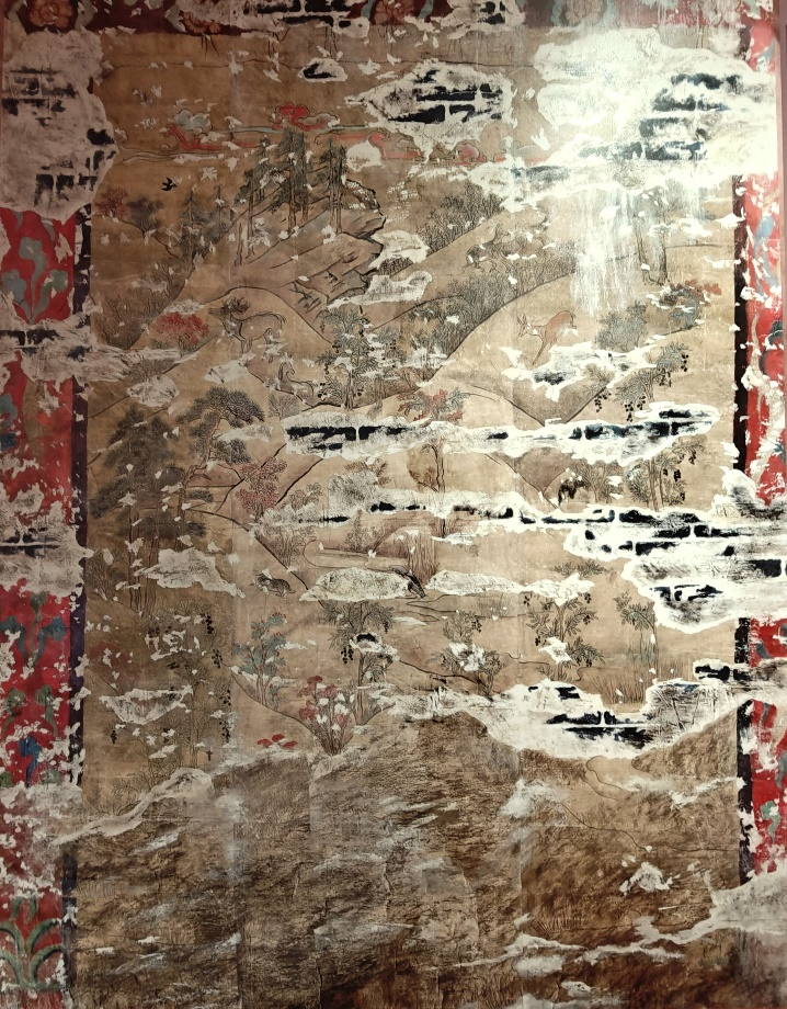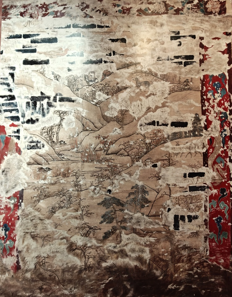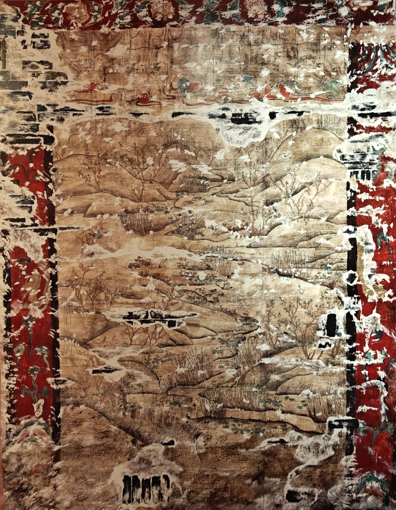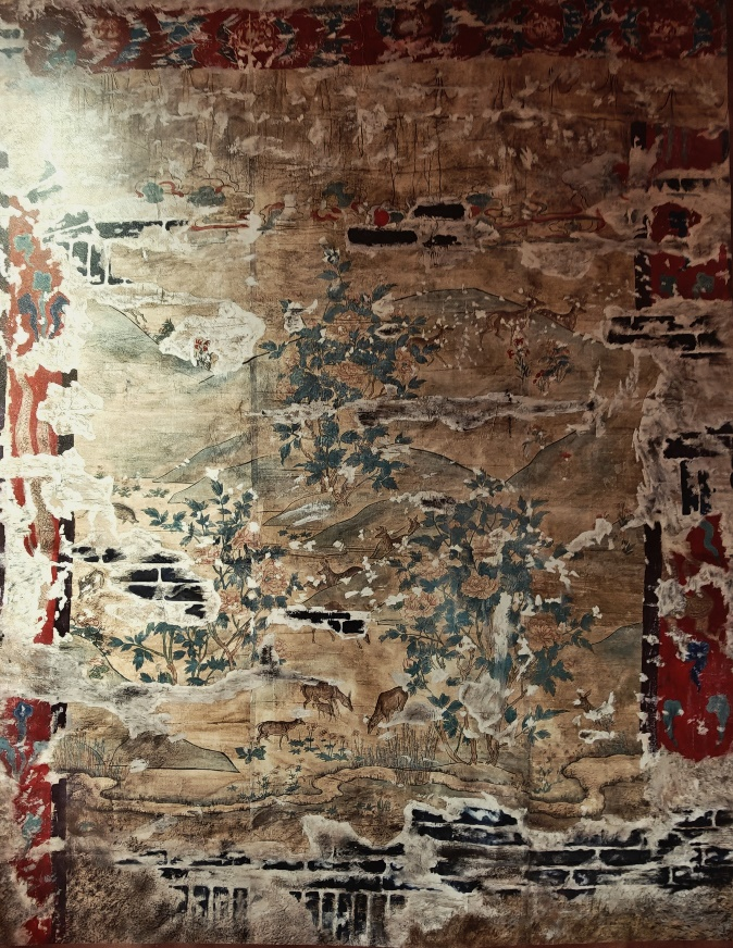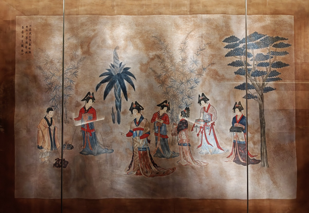 《寄锦图》绘于宝山辽墓 2 号墓石房南壁,画面清晰,色泽饱满。从题诗可以看出,这是苏若兰(左三女子)思念远征不归的丈夫,精心织成回文锦,寄与远方的亲人,表达眷恋之情。