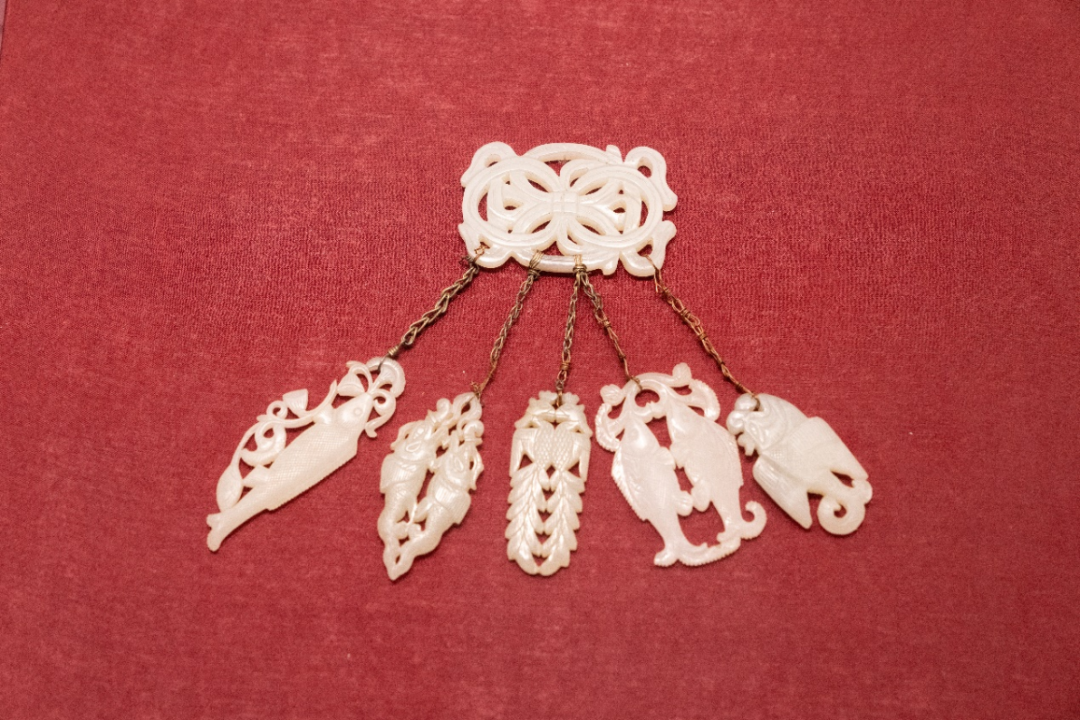 由一件镂雕绶带纹玉饰以鎏金银链垂挂五件玉坠组成。白玉制,透亮,洁白无瑕。镂雕绶带纹玉饰呈长方形片状,表面抛光。五件玉坠分为:龙鱼(摩羯)形玉坠,龙首,鸟翅,鱼身,嘴衔宝珠;双鱼形玉坠,腹鳍相接,双尾相连,头部上方雕刻莲花莲叶;双凤形玉坠,双翅并拢,长尾下垂;双龙形玉坠,龙首,鸟翅,鱼身,共衔一宝珠;鱼形玉缀,圆眼,鱼体细长,腹鳍浮于荷叶上,旁有两个莲蓬。