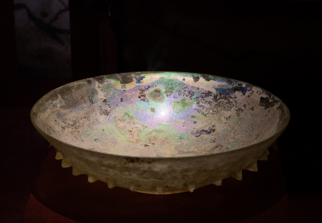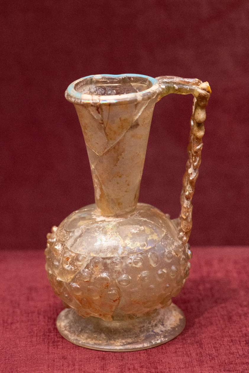 无色,透明,含有气泡,表面有风化层。侈口,双唇,漏斗形细高颈,球形腹,喇叭形高圈足。宽扁把连接口部与上腹部,用 10 层玻璃条堆成花式镂空状。口沿上涂一周淡蓝色颜料,腹壁饰五周小乳钉纹。