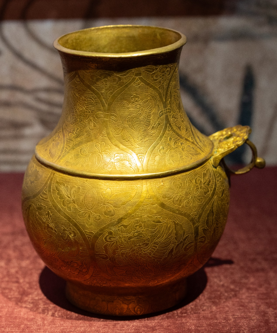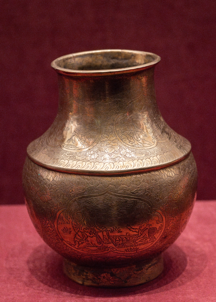 银质,通体鎏金。圆唇外卷,束颈,鼓腹,圈足。肩部出棱。颈、腹部各有四组如意形开光,其内装饰八幅孝子故事图,有“埋儿奉母”“扼虎救父”“闻雷泣墓”“刻木事亲”“卧冰求鲤”“拾葚供亲”“扇枕温衾”“托舆谏父”等。空隙处錾刻缠枝花卉纹,以鱼子纹作地。腹底部装饰养莲纹,圈足饰缠枝花卉纹。
