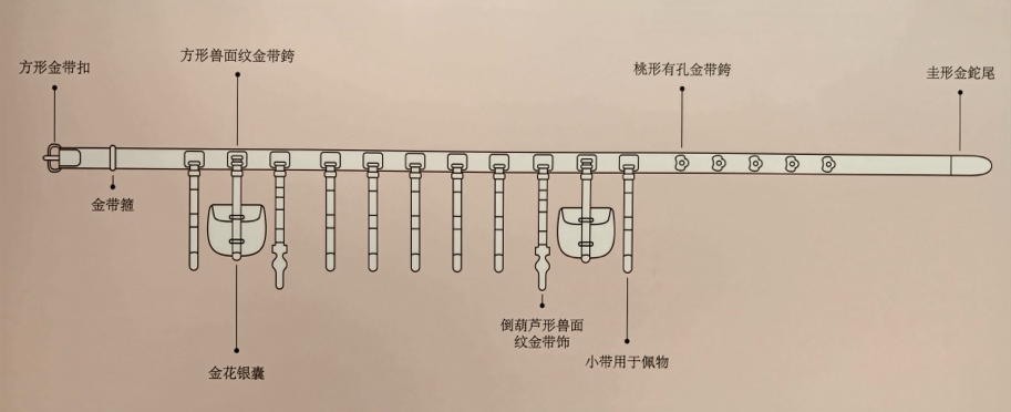 其中,蹀躞(dié xiè)为从腰带带銙引出的下垂小带。自契丹建国后,“蹀躞带”作为官方构件之一,被提升至礼制的高度,《辽史》记载有“武官七事:佩刀、刀子、磨石、契苾真、哕厥、针筒、火石袋”,学者指出其中“七事”便为“蹀躞带”的七种配件,成为了辽代官服中等级制度的象征。