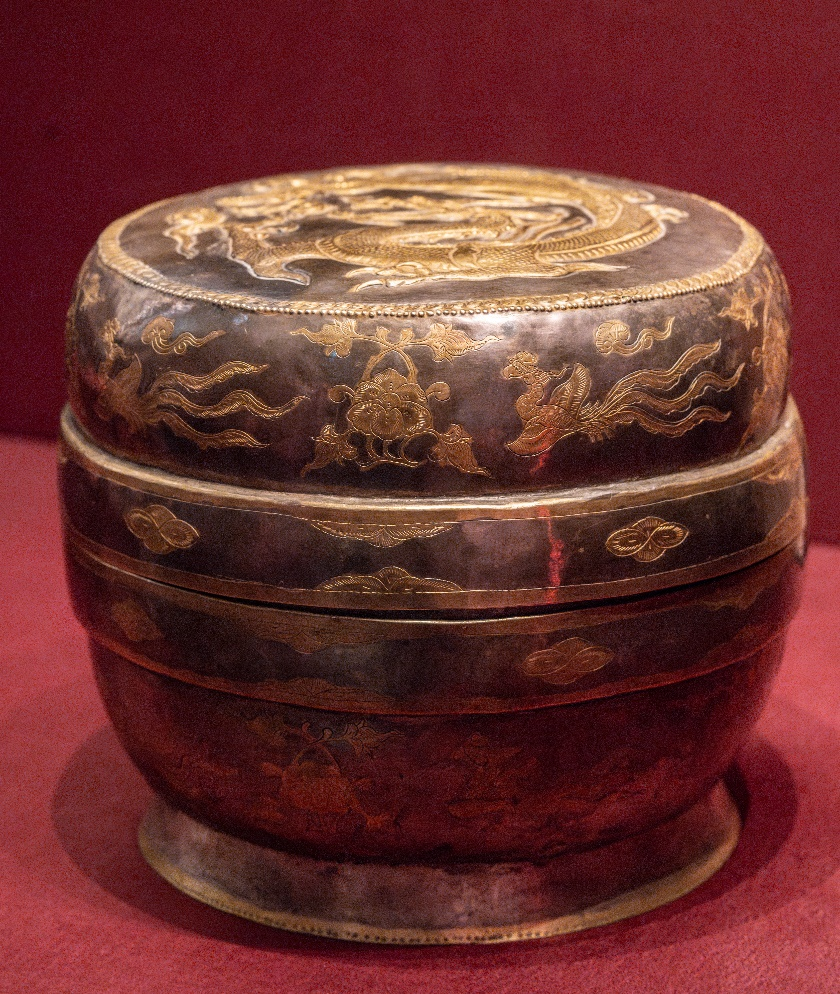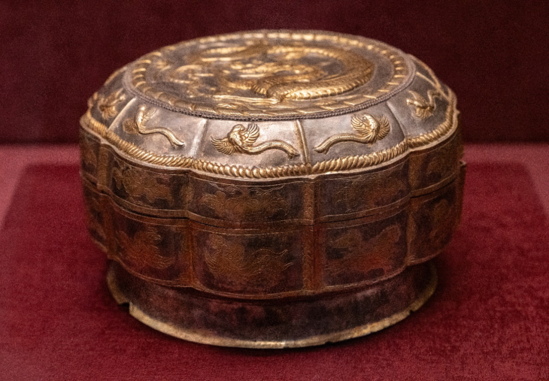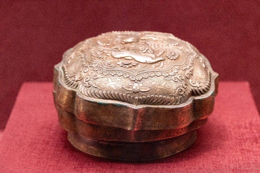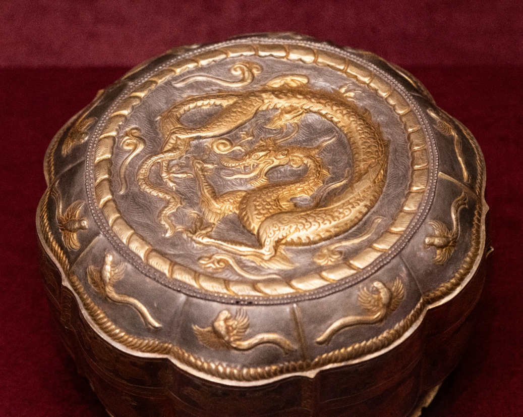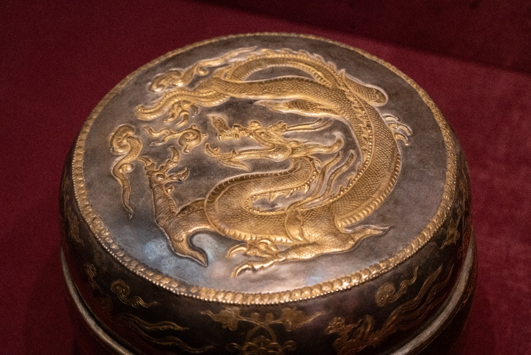 银质,纹饰錾刻、銮金。打制、焊接成形。盖与器身以子母口扣合。盖面为浅浮雕式行龙戏珠纹,边缘饰一周连珠纹和变形莲瓣纹。盖侧面和器身外壁纹饰相同,近口部各饰一周海棠纹,上下各为一周凤纹间饰折枝牡丹纹。圈足底边錾刻一周连珠纹。出土时奁盒内放有一件银盖罐和三件银盒。银盒内装有胭脂和粉。