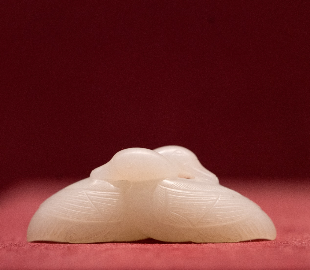 红色。整体雕成鸿雁形,呈卧伏状,圆眼,扭颈,嘴向下,头贴于翼,双足屈于腹下。腹部凿空,上有荷叶形小金盖,盖顶饰环形小钮,钮上系金链,链另一端系于颈部。