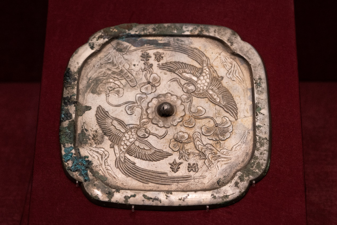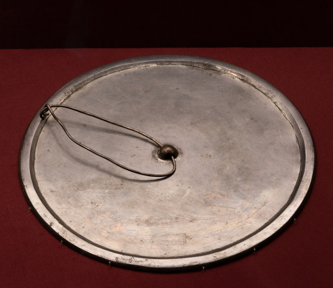 圆形,圆纽,无纽座,宽平缘。纽内穿有粗银丝制成的长环,以便悬挂。镜背光素,表面镀银。镜面光亮如新,仍可照人。