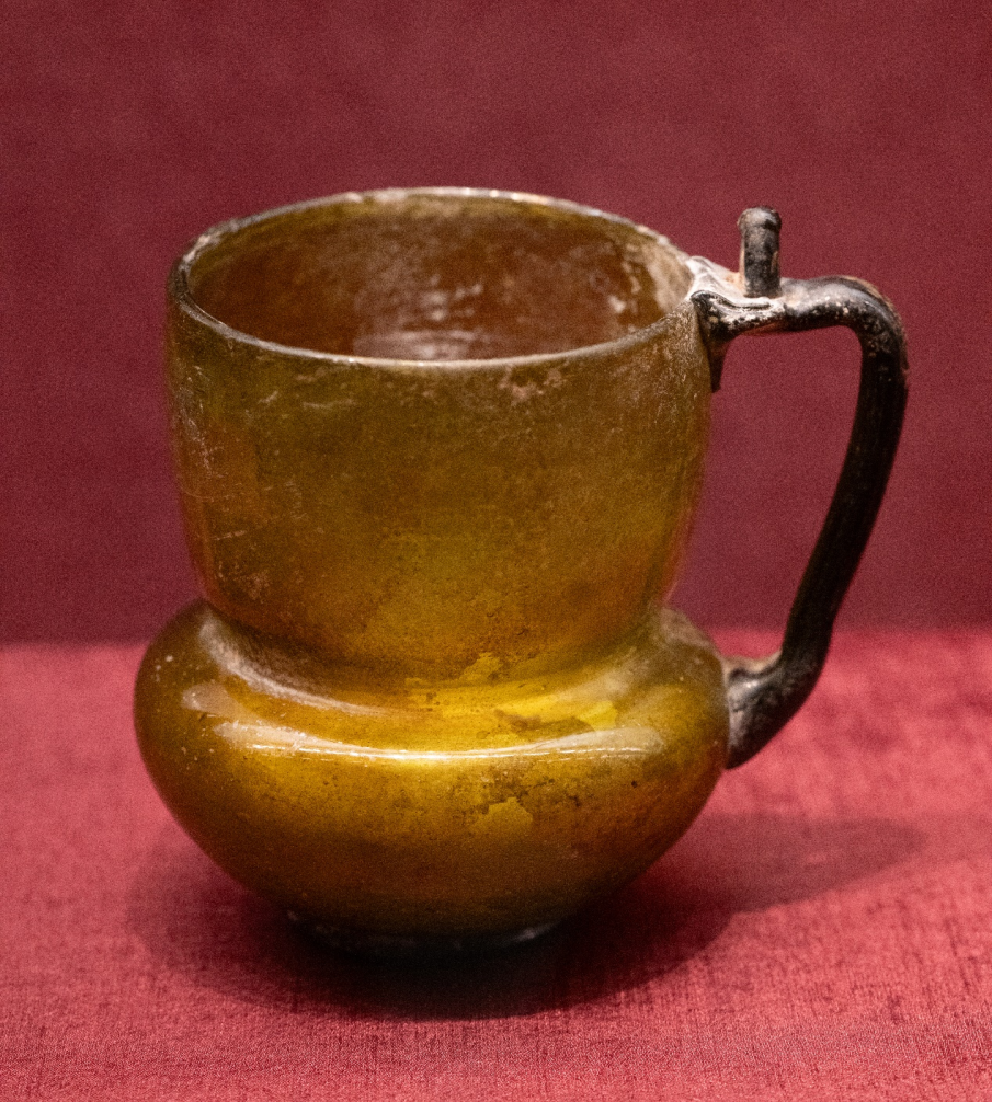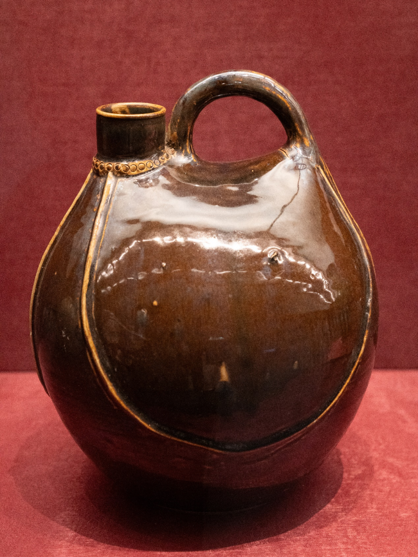 深棕色,透明,含有气泡,表面有风化层。口微敛,圆筒状颈,鼓腹,下腹斜内收,假圈足。扁圆柱形把手连接口部与肩部,把手上端有扁圆形突起,便于握持。