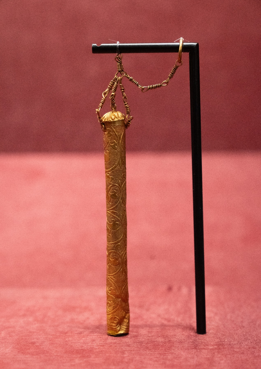 出土时置于公主腰部左侧。打制、焊接成形,纹饰錾刻。细长圆筒形,有盖,底部圆形薄金片封堵。盖顶隆起,顶部焊有细金丝制成的小环纽,盖身为一小短筒,可插入针筒内。筒口外侧焊接两个左右对称的小环纽,纽内各穿系一条双环束腰式金链,上端与盖顶所系金链合并,同系于另一条金链上。链端系有金环,易于佩挂。盖顶錾刻双重覆莲纹,筒身外壁錾刻缠枝忍冬花纹,衬以鱼子纹地。