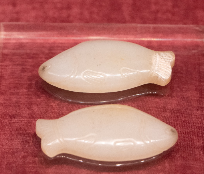 出土时置于公主腹部。白玉质,器表抛光。整体呈鱼形,以子母口相扣合,内空。用细线刻出鱼的眼、腮、脊、腹鳍。鱼嘴部横钻一孔。