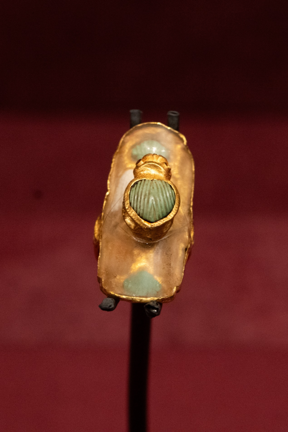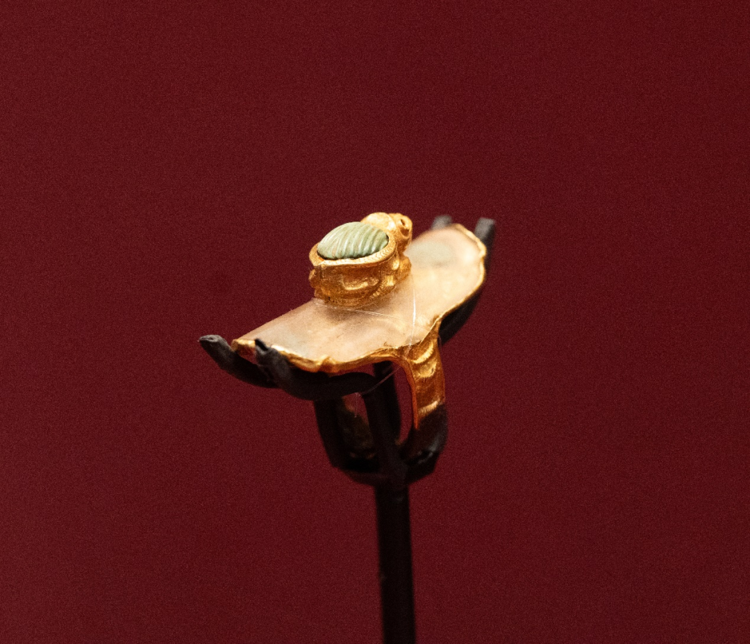 出土时佩戴于墓主手指上。戒面成盾形,金托座捶揲成形,錾刻卷草水波纹,其上镶嵌水晶,两端略翘,中间稍凹。上伏一只蟾蜍,爪蜷头昂,背部镶嵌绿松石,刻有弧形形纹饰。戒壁有錾刻纹饰,原应镶嵌绿松石,下端有褐色织物缠绕。