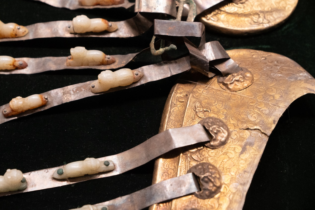 契丹一族是马背上的民族,辽王朝女性尤其是贵族女性同样可以骑马驰骋,《辽史》中还记载有不少英勇善战的女性,比如景宗睿智皇后曾一度大胜宋太宗的“雍熙北伐”,逼迫宋军签署了为人所熟知的“澶渊之盟”。辽代女性从来不是受制于深闺之中的金丝雀,她们英姿飒爽、以马为家。因此,马具是契丹女性日常生活中的必需品,从完备且精美的马具中,后人也可一瞥她们“骋容与兮跇万里”的身影与纵横于天地间的豪情壮志。