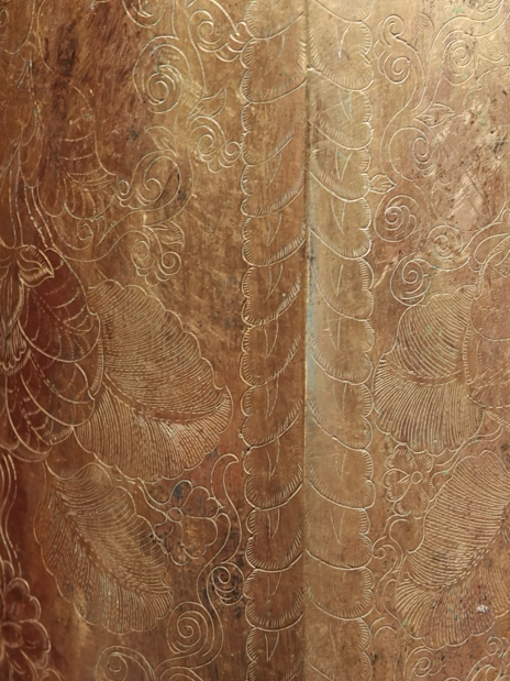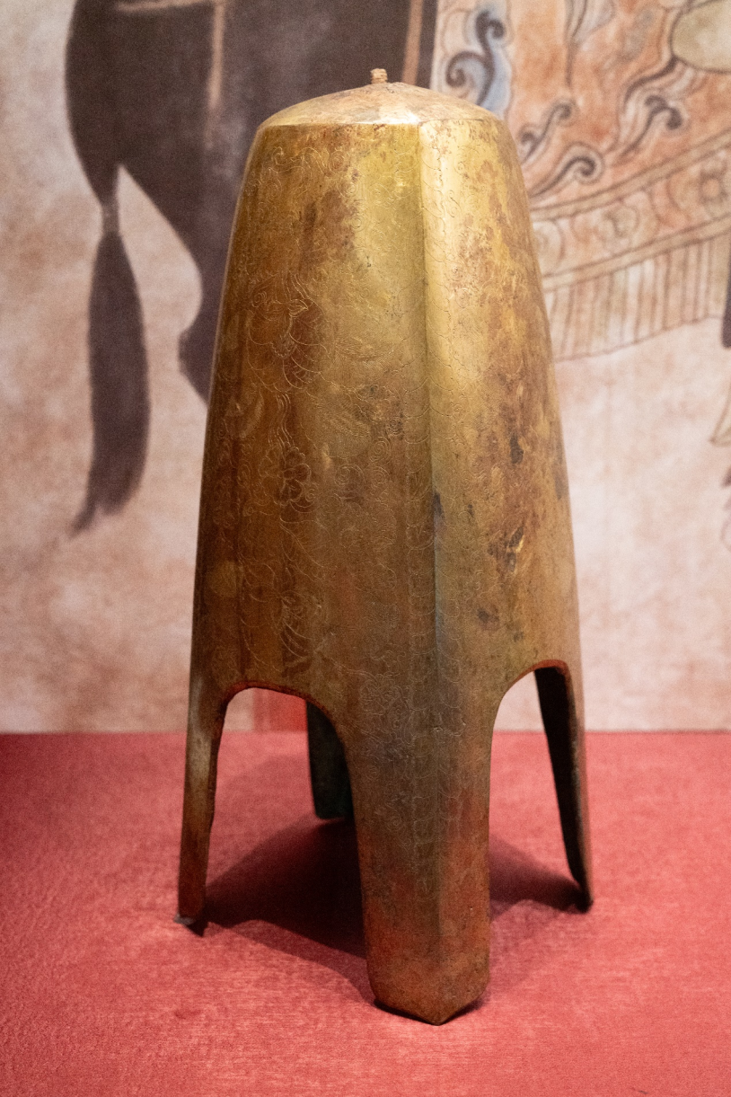 铜质,通体鎏金。铎顶部有铁环吊钮,四底呈四棱镂空花瓣形。器身表面錾刻缠枝牡丹花叶纹。
