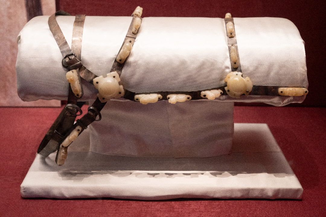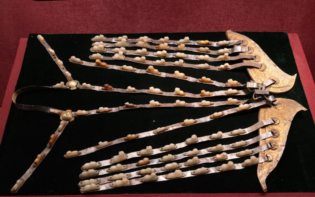 由项带、额带、颊带、咽带、鼻带组成。带上钉缀马形玉饰、狻猊形玉饰共 22 件,四叶花形玉节约 2 件、银带扣 6 件、银带箍 7 件。