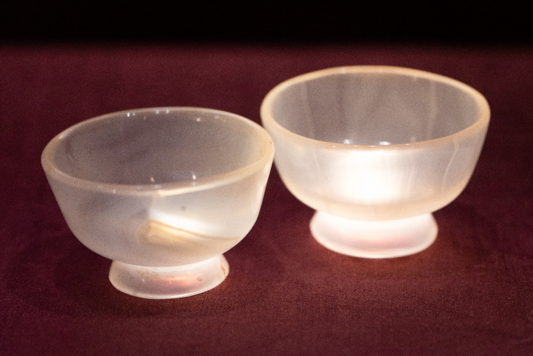 大小、形制均相同。白色,敞口,圆唇,弧腹,圈足。腹壁有自然纹理,表面抛光。