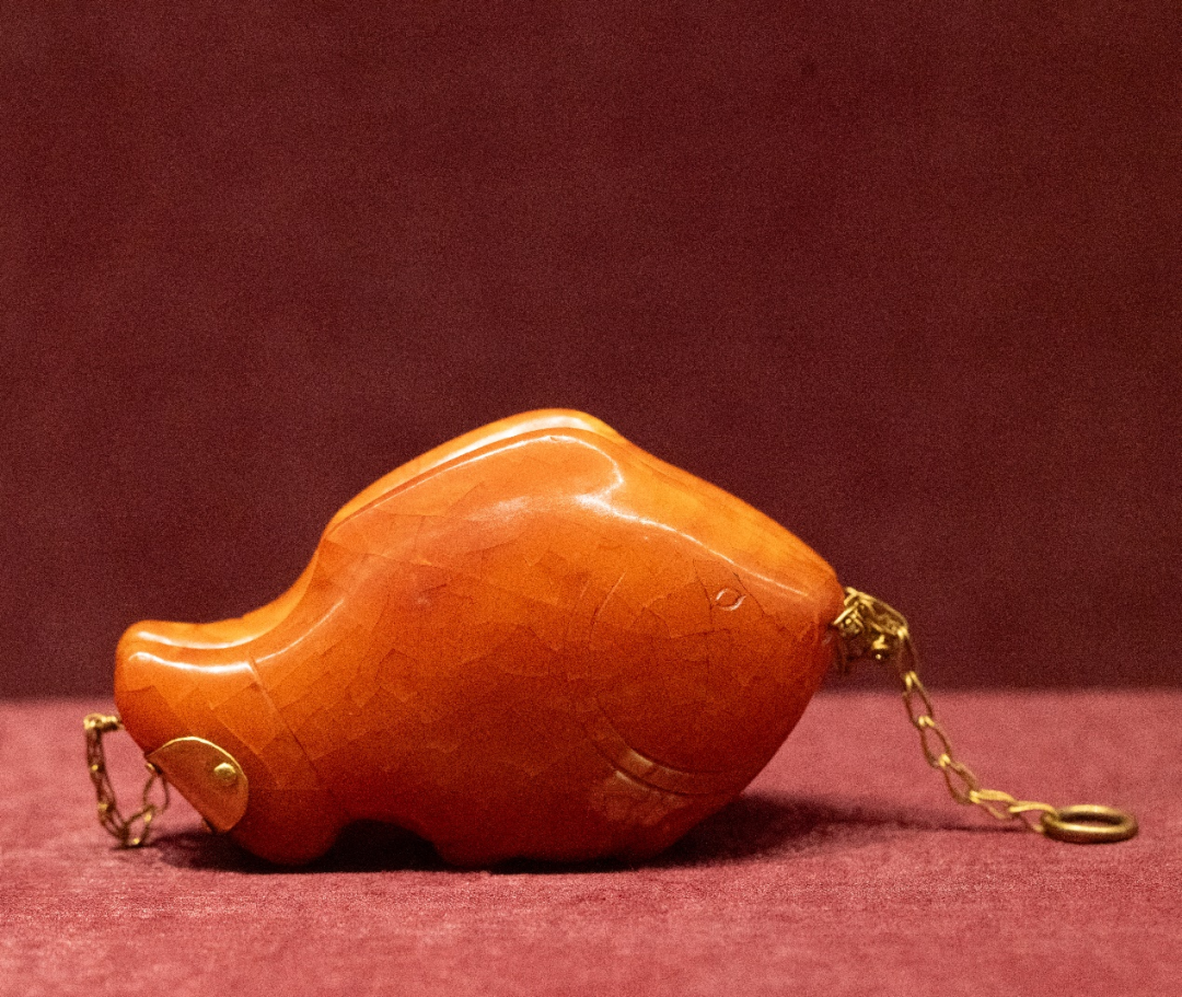 出土时置于公主腰部右侧。橘红色。整体呈鱼形,鱼背凸起,以子母口相扣合。嘴部穿孔,内穿金链,上端系金环。鱼尾部钉合页形金片,系有金链,一端有金插销。