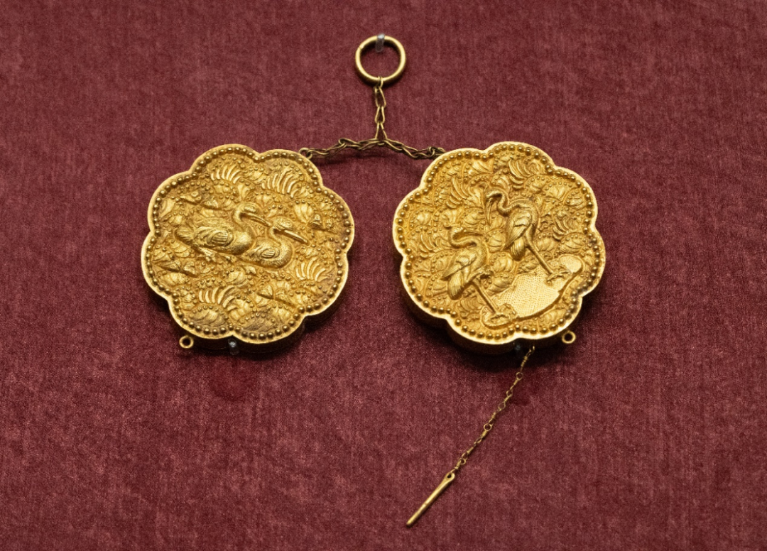 出土时置于公主腰部右侧。捶揲成形,纹饰錾刻。盒呈八曲连弧形,盖与盒身以子母口相扣合,上下对称。盒外两侧焊接两对金纽,一侧穿系金链用于佩挂,一侧穿系插栓,用以固定盖与盒身。盒面錾刻一对鸳鸯,盒底錾刻双鹤,均为半浮雕式,周围饰以水波、萱草纹,外缘饰一周连珠纹。侧壁对称饰卷草纹。