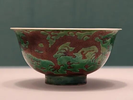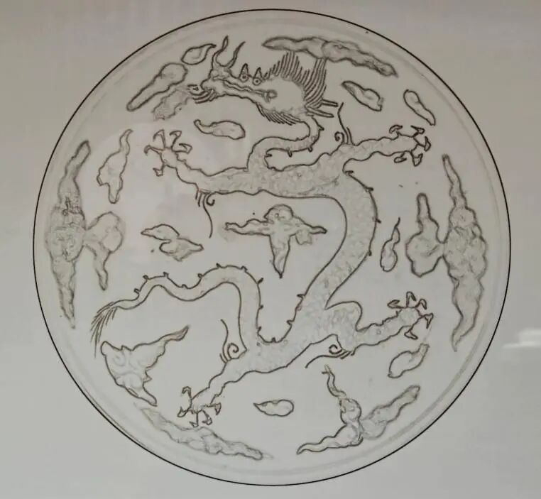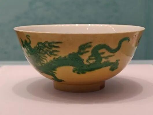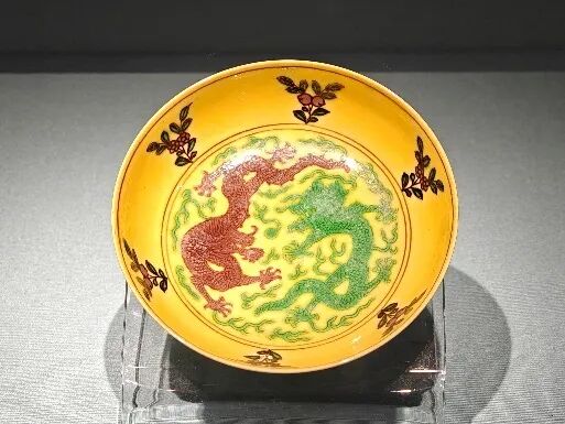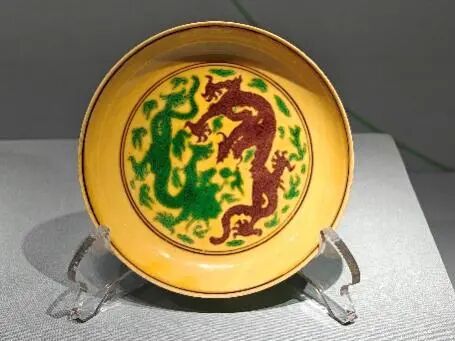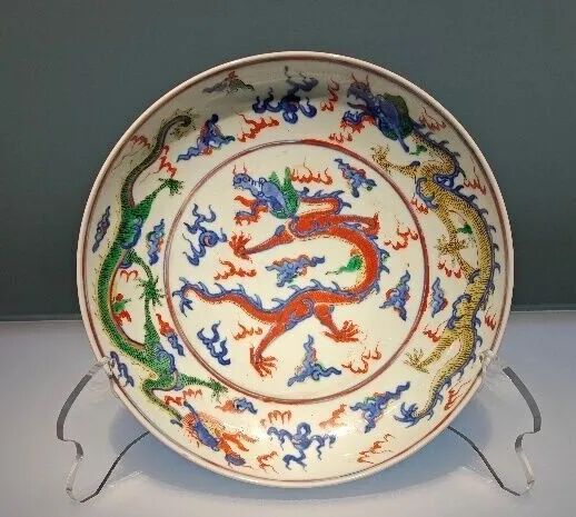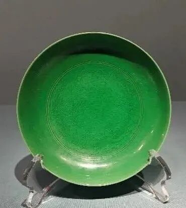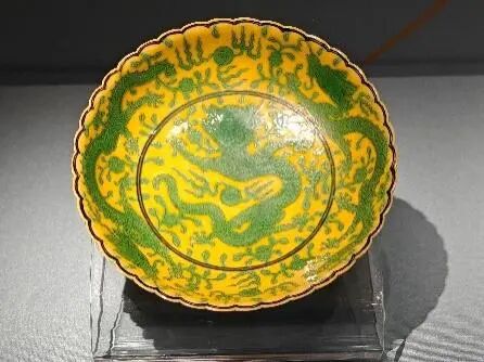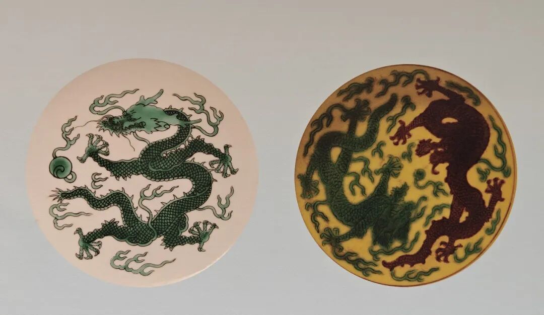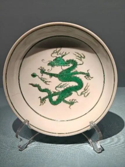绿龙盘始见于明成化朝,是明清时期官窑瓷的传统品种。明代绿龙纹多直接绘彩,少有勾边线,而清代绿龙盘则多用彩勾边,再于其中填绿彩,康熙时期的绿龙盘以黑彩勾线,雍正时期则是线烧成淡描青花,再于双勾线内填绿彩。